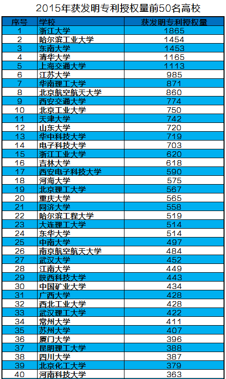 2015年高校獲發(fā)明專利授權量前50名:http://www.cutech.edu.cn/cn/zscq/2016/02/1455730697834009.htm