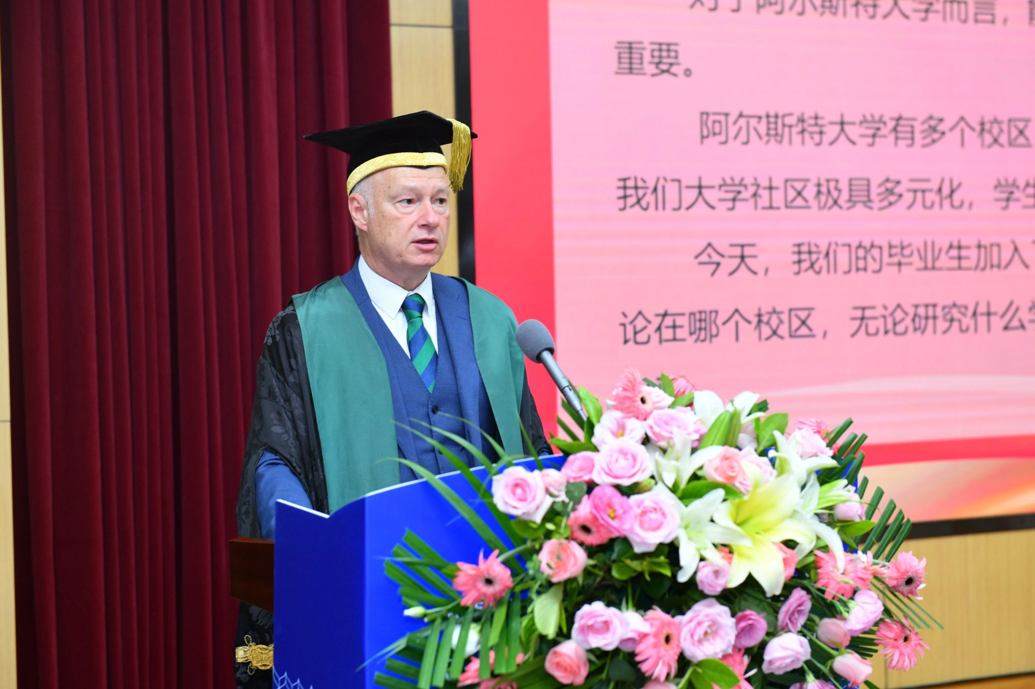 晴日暖風(fēng)生麥氣,綠陰幽草勝花時(shí)。6月26日下午,陜西科技大學(xué)阿爾斯特學(xué)院2024屆畢業(yè)生學(xué)位授予儀式在圖書(shū)館學(xué)術(shù)報(bào)告廳舉行。校長(zhǎng)李志健、阿爾斯特大學(xué)校長(zhǎng)Paul Bartholomew、副校長(zhǎng)蒲永平出席儀式,阿爾斯特大學(xué)計(jì)算機(jī)、工程與建筑環(huán)境學(xué)部副部長(zhǎng)Paul Hanna,我校國(guó)際合作與交流處、財(cái)務(wù)處、教務(wù)處等相關(guān)部門(mén)負(fù)責(zé)人,阿爾斯特學(xué)院領(lǐng)導(dǎo)班子成員、學(xué)院專(zhuān)業(yè)負(fù)責(zé)人、全體教職工、2024屆畢業(yè)生及家長(zhǎng)代表參加儀式。儀式由阿爾斯特學(xué)院常務(wù)副院長(zhǎng)薛朝華主持。