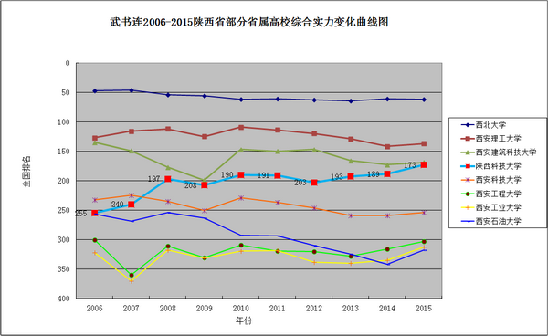 中國(guó)管理科學(xué)研究院武書連主持的《2015中國(guó)大學(xué)評(píng)價(jià)》大學(xué)排行榜于年初公布,我校綜合實(shí)力居全國(guó)高校第173名,分別位列陜西省高校和全國(guó)輕工特色院校第10位和第2位,較2014年上升16位,創(chuàng)近十年來(lái)歷史新高,是唯一一所排名呈總體上升趨勢(shì)的陜西省省屬高校。