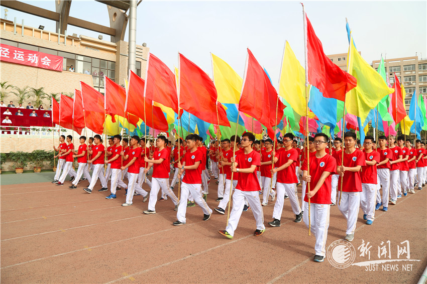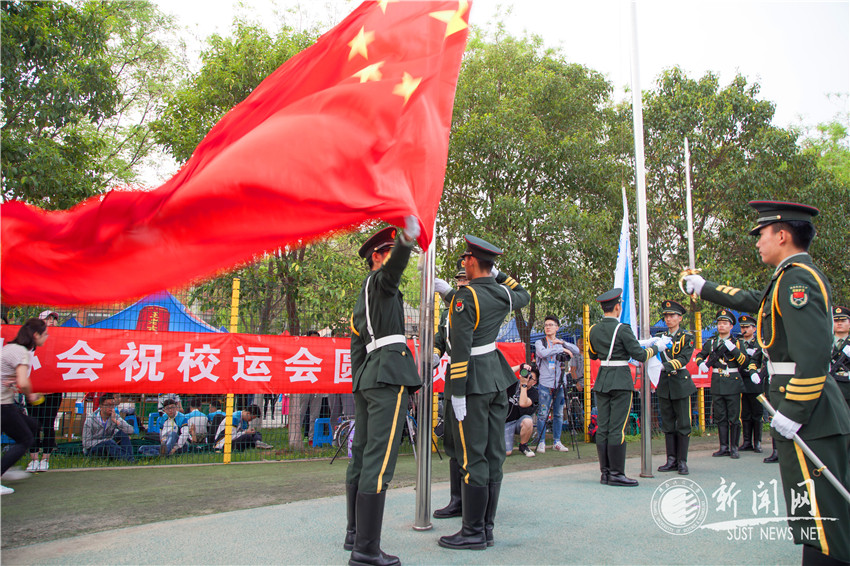 隨后,在雄壯的國歌聲和校歌聲中,五星紅旗、校旗和運(yùn)動(dòng)會(huì)會(huì)旗相繼冉冉升起。