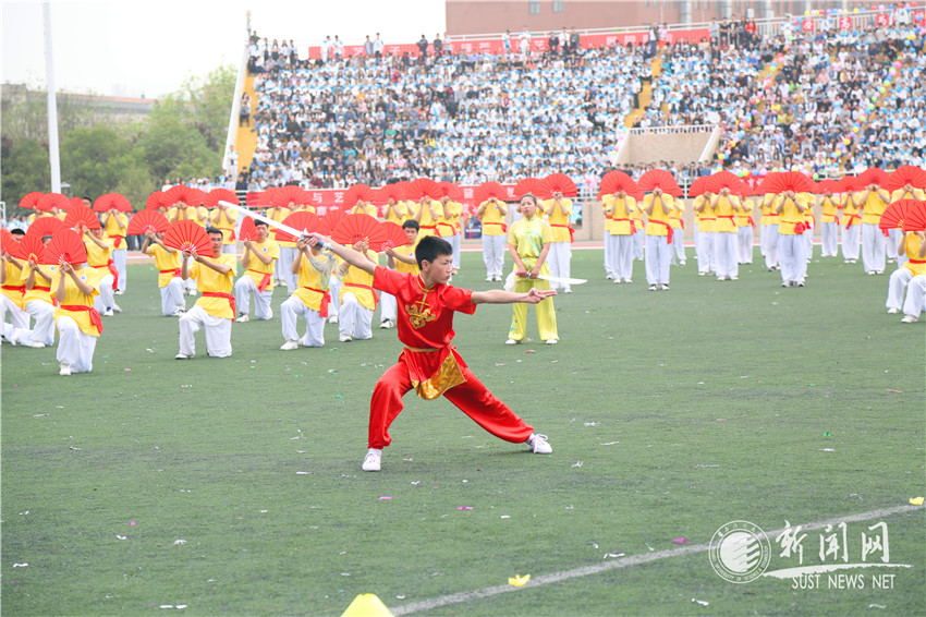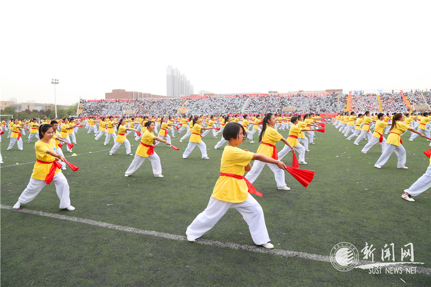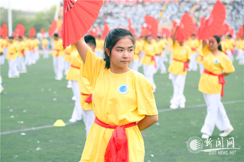 由近千名大學(xué)生表演的花環(huán)舞、功夫扇和大型團(tuán)體操剛?cè)岵?jì)、活力四射,突出體現(xiàn)了青年元素、陽光體育和全民健身,將開幕式的氣氛推向了高潮。