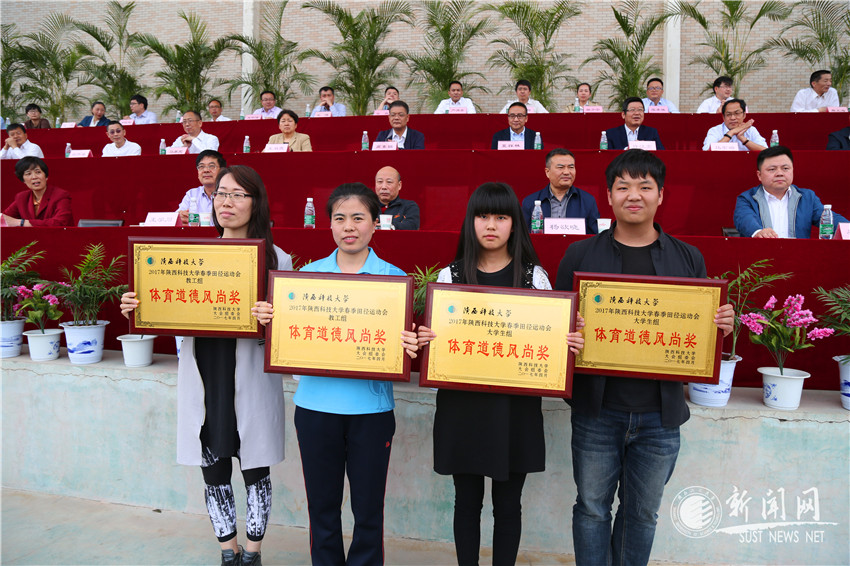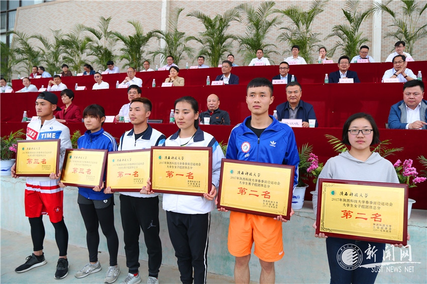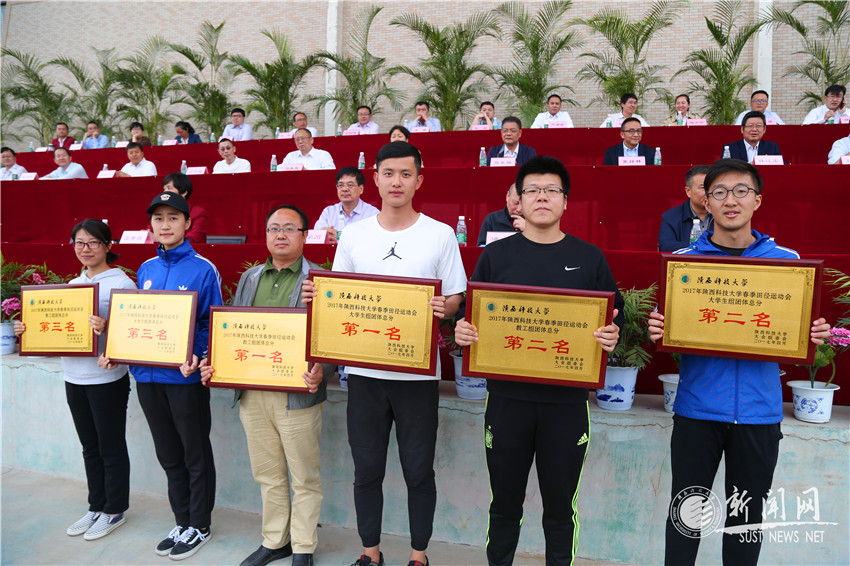 總裁判長(zhǎng)莊希琛宣布競(jìng)賽成績(jī)、獲得“體育道德風(fēng)尚獎(jiǎng)”單位名單,與會(huì)領(lǐng)導(dǎo)為獲獎(jiǎng)單位頒獎(jiǎng)。尤為搶眼的是,電氣與信息工程學(xué)院孫奕同學(xué)以10秒9的成績(jī)打破男子100米賽跑保持20年之久的校記錄。根據(jù)組委會(huì)公布的得分統(tǒng)計(jì),電氣與信息工程學(xué)院分會(huì)、食品與生物工程學(xué)院分會(huì)和保障分會(huì)分別獲得教工組前三名;鎬京學(xué)院、經(jīng)濟(jì)與管理學(xué)院和材料科學(xué)與工程學(xué)院分別獲得大學(xué)生組前三名;大學(xué)生女子團(tuán)體前三名分別為鎬京學(xué)院、經(jīng)濟(jì)與管理學(xué)院、材料科學(xué)與工程學(xué)院;大學(xué)生男子團(tuán)體前三名分別為鎬京學(xué)院、材料科學(xué)與工程學(xué)院、經(jīng)濟(jì)與管理學(xué)院。文理學(xué)院分會(huì)、輕工科學(xué)與工程學(xué)院分會(huì)獲得教工體育道德風(fēng)尚獎(jiǎng),機(jī)電工程學(xué)院、電氣與信息工程學(xué)院獲得大學(xué)生體育道德風(fēng)尚獎(jiǎng)。