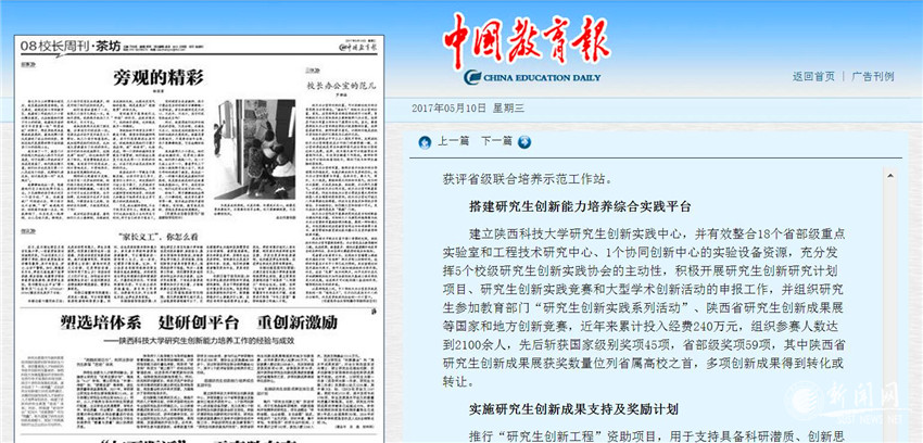 5月10日,《中國教育報》以《塑選培體系 建研創(chuàng)平臺 重創(chuàng)新激勵》為題,報道我校研究生創(chuàng)新能力培養(yǎng)工作的經(jīng)驗與成效。
