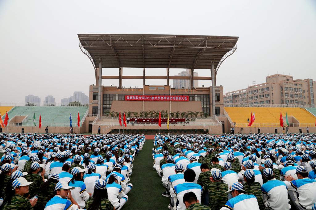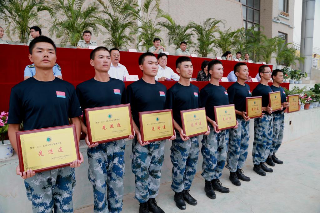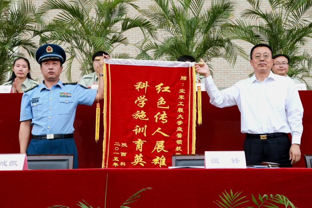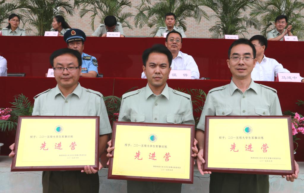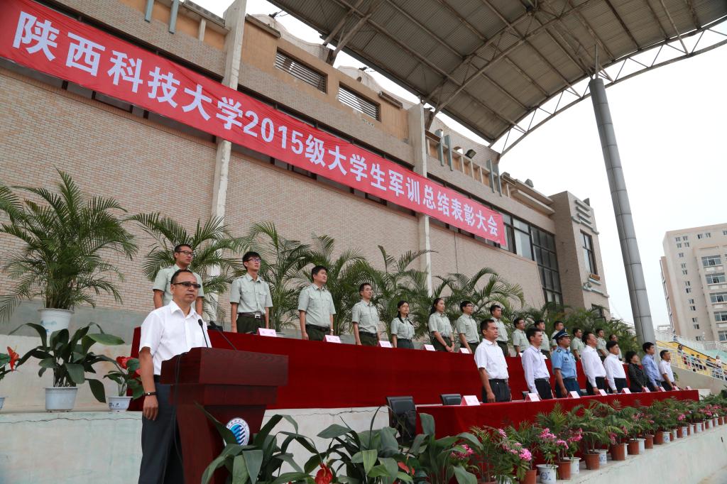 我校2015級大學(xué)生軍訓(xùn)總結(jié)表彰大會于9月18日在標(biāo)準田徑運動場隆重舉行。黨委副書記溫鋒、副校長馬建中、空軍工程大學(xué)領(lǐng)航學(xué)院教科辦主任魏成凱出席大會,大會由軍訓(xùn)團政委、學(xué)工部(武裝部)部長劉運主持。 大會在雄壯的國歌聲中開始。參訓(xùn)代表方陣、國旗護衛(wèi)隊、以及參訓(xùn)教官代表分別進行了隊列展示和軍體拳表演,昂揚向上的精神風(fēng)貌、整齊劃一的表演贏得現(xiàn)場同學(xué)的陣陣掌聲。副校長馬建中宣讀了《關(guān)于表彰二〇一五級大學(xué)生軍訓(xùn)先進集體及先進個人的決定》,管理學(xué)院新生營、食品與生物工程學(xué)院新生營、職業(yè)教育師范學(xué)院新生營榮獲陜西科技大學(xué)2015級大學(xué)生軍事訓(xùn)練先進營稱號;王松峰、嚴渭青、薛力源榮獲優(yōu)秀教導(dǎo)員稱號;一營二連、二營三連等15個連隊榮獲先進連稱號;袁家年、董志東等15人榮獲優(yōu)秀教官稱號;李晨宇、呂玥澄等15人榮獲優(yōu)秀指導(dǎo)員稱號;席濤等246名同學(xué)榮獲優(yōu)秀學(xué)員稱號。溫鋒向魏成凱大校贈送了“紅色傳人展雄風(fēng),科學(xué)施訓(xùn)育英才”的錦旗。 四營學(xué)員進行隊列展示 國旗護衛(wèi)隊隊列展示 九營學(xué)員表演軍體拳 承訓(xùn)教官表演軍體拳 馬建中副校長宣讀表彰決定 四營、七營、十二營獲得先進營 一營二連等連隊獲得先進連 溫鋒副書記向魏成凱大校贈送錦旗 溫鋒副書記在大會上做軍訓(xùn)總結(jié)講話 溫鋒在大會上做了軍訓(xùn)總結(jié)講話。他指出,2015級大學(xué)生軍訓(xùn)工作在軍訓(xùn)委員會的有力組織和軍訓(xùn)團的精心實施下,圓滿地完成了各項軍訓(xùn)任務(wù),取得了良好的施訓(xùn)實效。他強調(diào),來校承訓(xùn)的69名教官按照軍訓(xùn)計劃,科學(xué)實施、嚴格管理,確保了軍訓(xùn)的質(zhì)量與效果,展示了良好的精神風(fēng)貌;全體參訓(xùn)干部,尤其是一線輔導(dǎo)員,既抓軍事訓(xùn)練和軍事素質(zhì),又抓思想政治教育和思想作風(fēng),較好地履行了管理和服務(wù)職責(zé)。2015級大學(xué)生在訓(xùn)練中錘煉了艱苦奮斗、吃苦耐勞的堅強毅力和集體主義精神,養(yǎng)成了良好的生活作風(fēng),邁好了大學(xué)生活的第一步。他希望,全體同學(xué)能繼續(xù)保持和發(fā)揚軍訓(xùn)中的好思想、好習(xí)慣、好作風(fēng),在今后的學(xué)習(xí)和生活中不斷砥礪意志,嚴格要求自我,努力做一名品學(xué)兼優(yōu)的大學(xué)生。