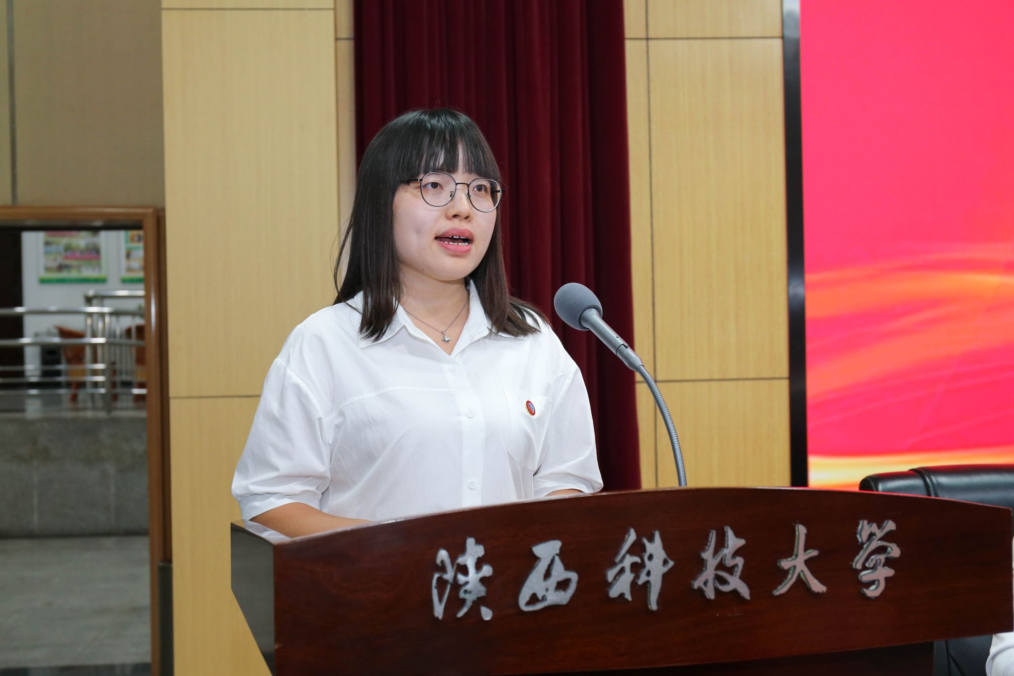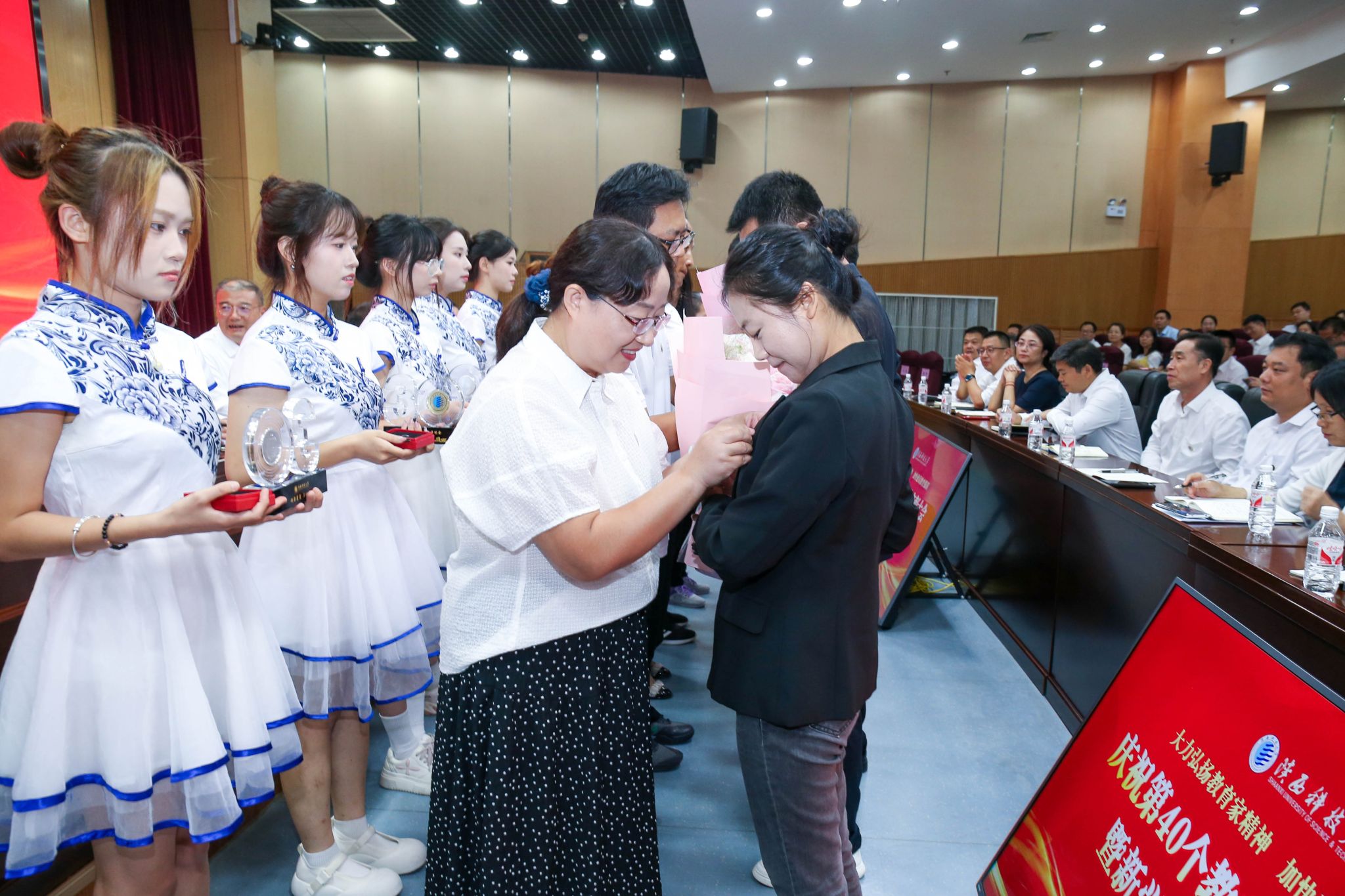 新進(jìn)教師代表為從教滿三十年教師代表送上鮮花祝福,從教滿三十年教師代表為新進(jìn)教師代表佩戴?;?,寓意兩代教師將陜科大精神,將立德樹人、教書育人的榮譽(yù)和使命薪火相傳。