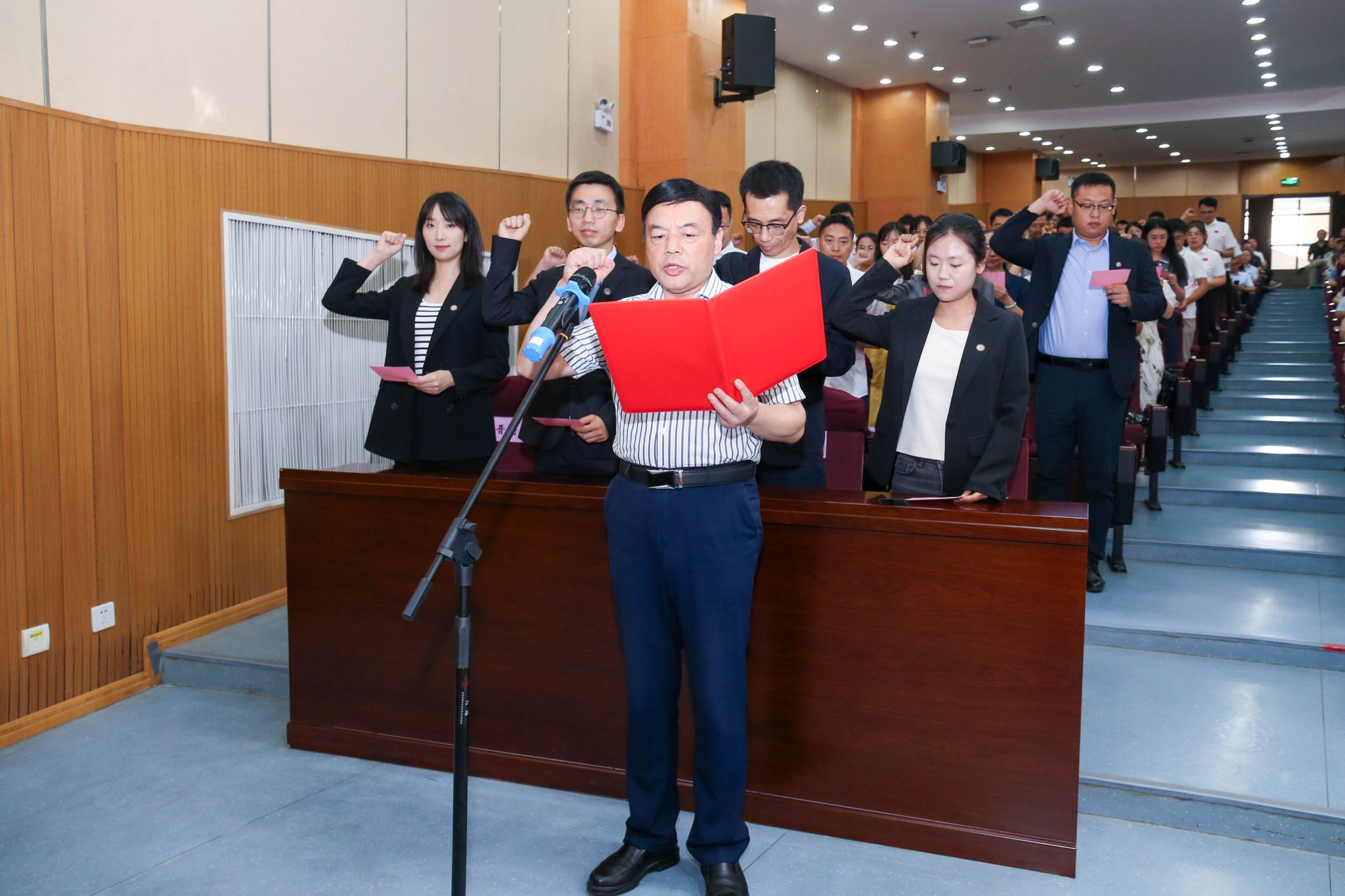 在全國模范教師、二級教授、數(shù)學(xué)與數(shù)據(jù)科學(xué)學(xué)院張小紅的領(lǐng)誓下,在場全體新入職教師莊嚴(yán)宣誓,嘹亮的宣誓聲回蕩在會場,彰顯著新入職教師們積極投身教育強(qiáng)國建設(shè)的信念和決心。