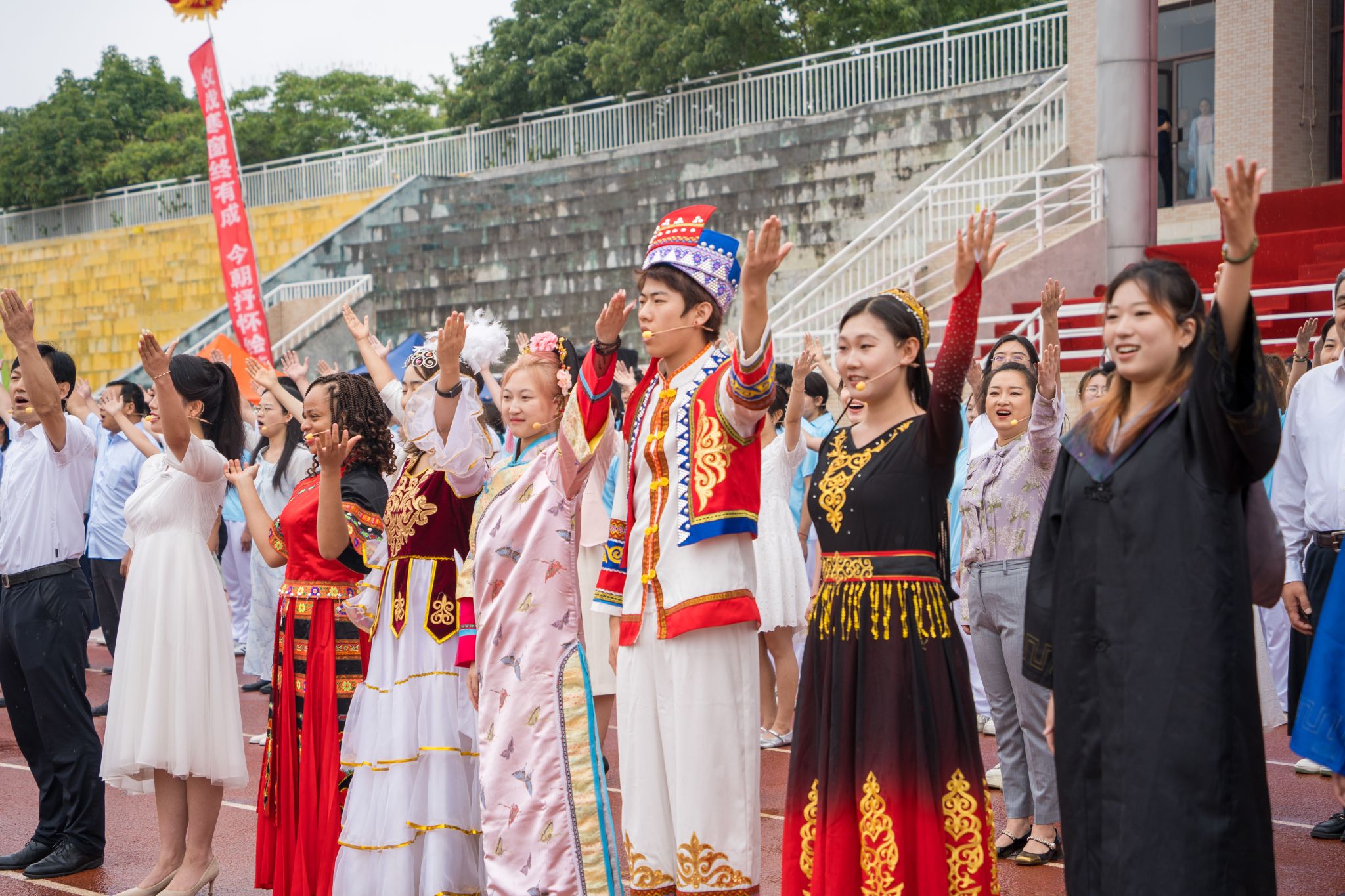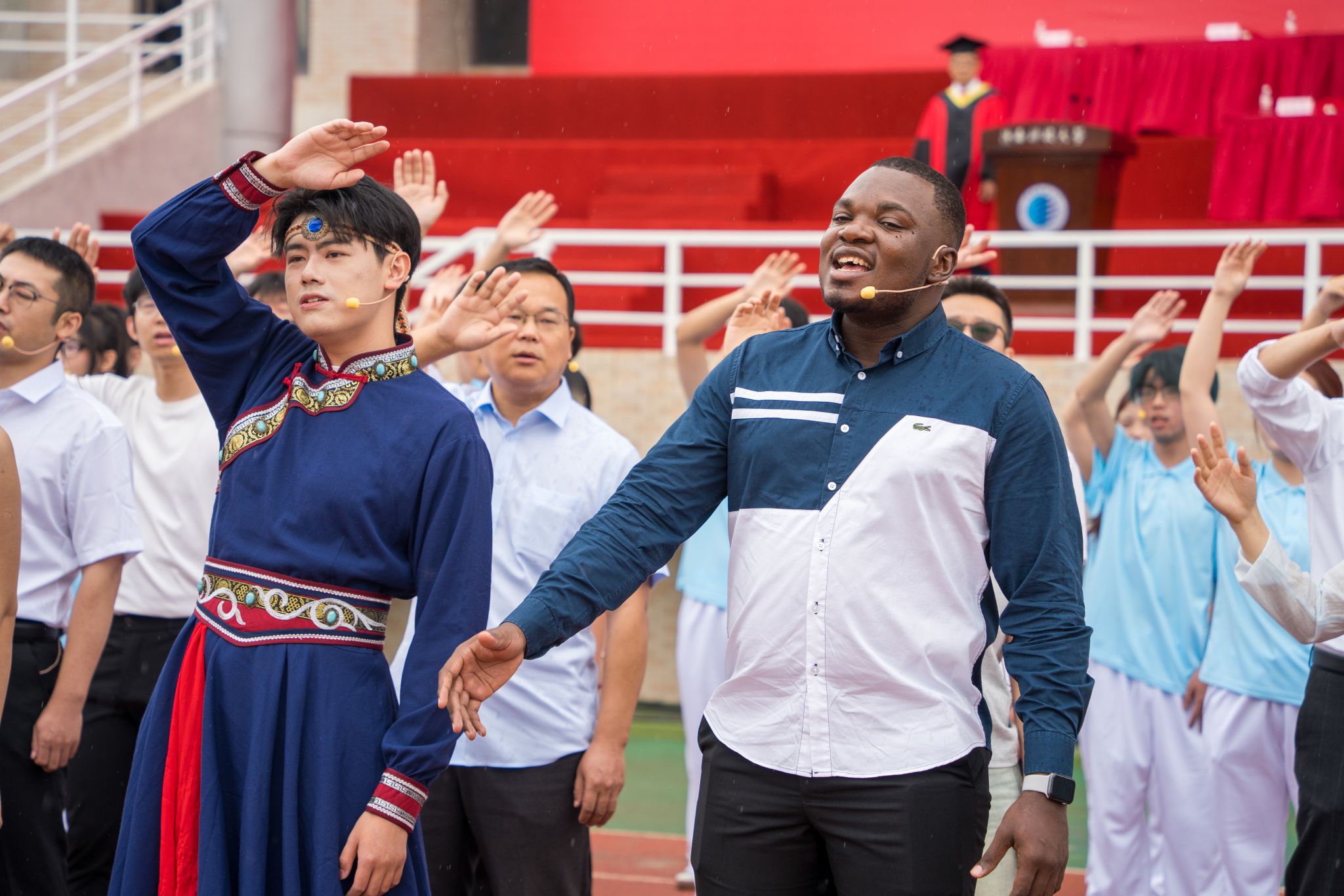 典禮最后,在畢業(yè)生即將啟程之際,全校16個(gè)學(xué)院(部)的教師代表與大學(xué)生藝術(shù)團(tuán)用歌聲為畢業(yè)生送上最美好的祝福。