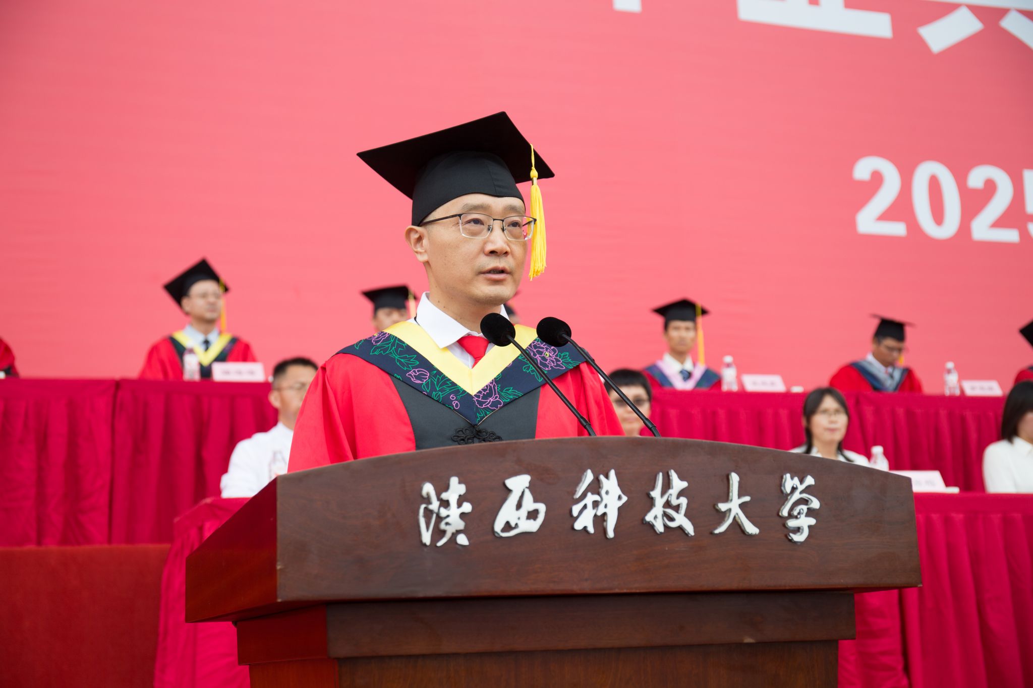 副校長陸趙情宣讀“陜西科技大學(xué)關(guān)于授予2025屆博士、碩士、學(xué)士學(xué)位的相關(guān)決議”及“陜西科技大學(xué)關(guān)于批準(zhǔn)2025年優(yōu)秀碩士學(xué)位論文的決定”。學(xué)校授予66名研究生博士學(xué)位、1585名研究生碩士學(xué)位、19名國際研究生碩士學(xué)位、4547名本科生學(xué)士學(xué)位;批準(zhǔn)120篇學(xué)位論文為優(yōu)秀碩士學(xué)位論文。