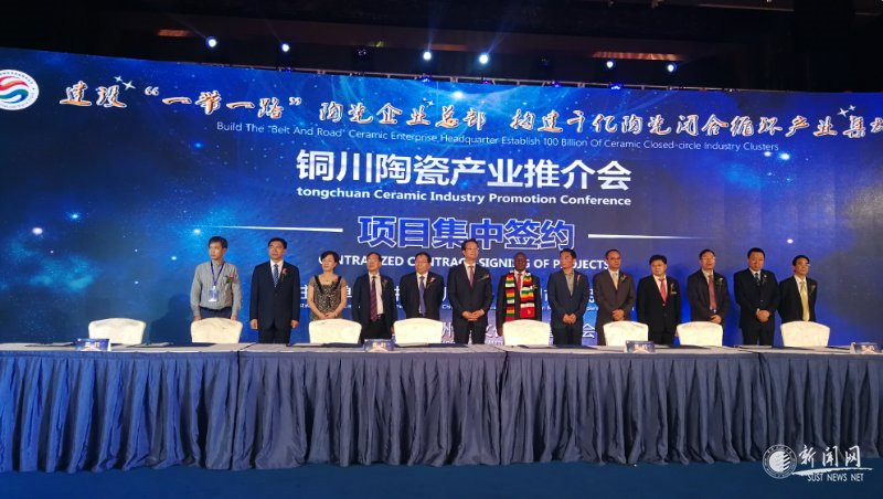 姚書(shū)志(左五)與銅川市市長(zhǎng)李智遠(yuǎn)(左六)等領(lǐng)導(dǎo)見(jiàn)證銅川陶瓷項(xiàng)目簽約
