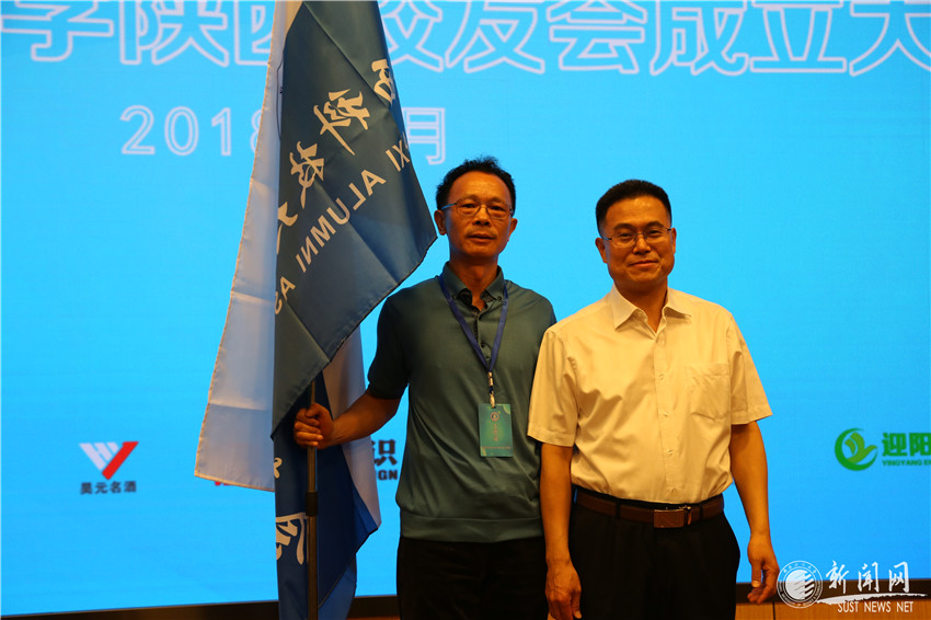馬建中代表校友總會為陜西校友會第一屆理事會成員授旗并代表學校贈送禮品。
