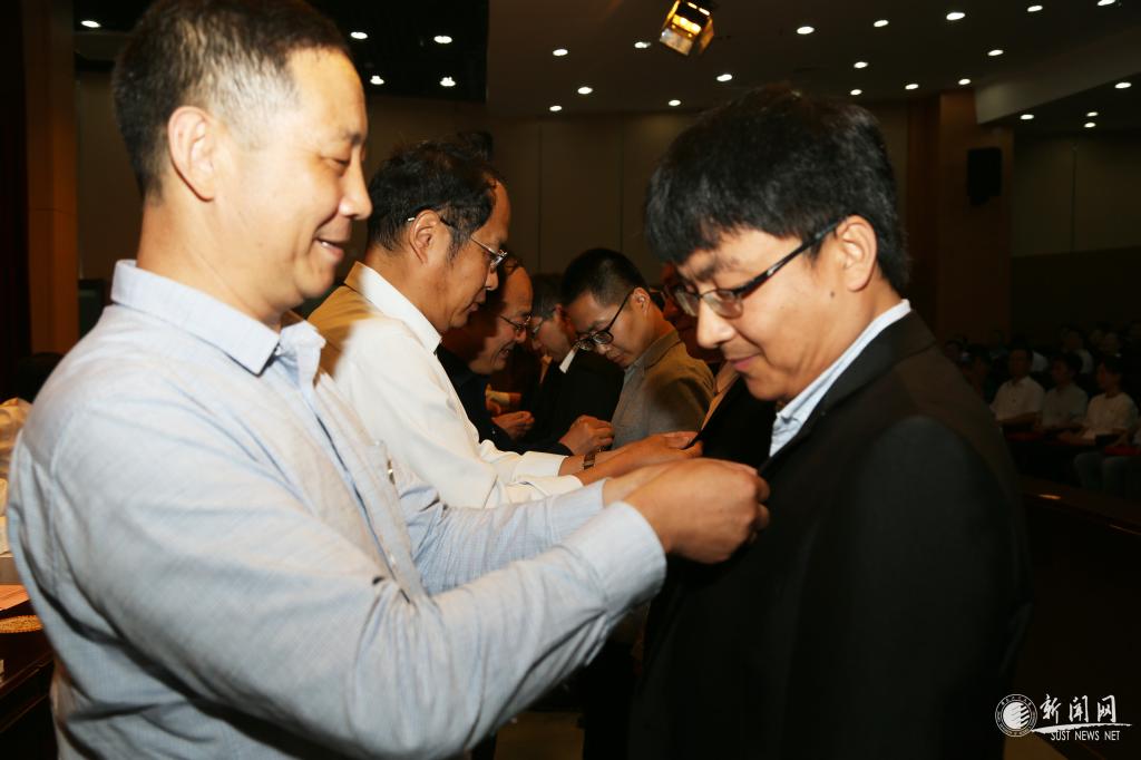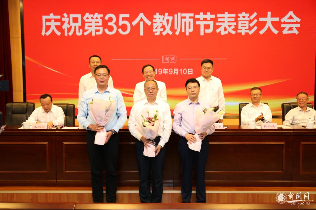 在熱烈的氣氛中,與會校領(lǐng)導(dǎo)向2018年度優(yōu)秀教師及先進(jìn)工作者頒發(fā)榮譽(yù)證書,向從教滿三十年榮譽(yù)教師頒發(fā)紀(jì)念獎杯,向在2018-2019學(xué)年度獲得突出業(yè)績的優(yōu)秀教職工代表送上表達(dá)祝福和感謝的鮮花。令人感動的是,從教滿三十年榮譽(yù)教師還為新進(jìn)教師代表佩戴?;?,傳遞了一份立德樹人的責(zé)任與期待,這也是我校本屆教師節(jié)表彰活動的一個新增環(huán)節(jié)。