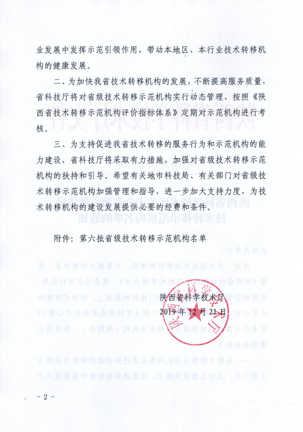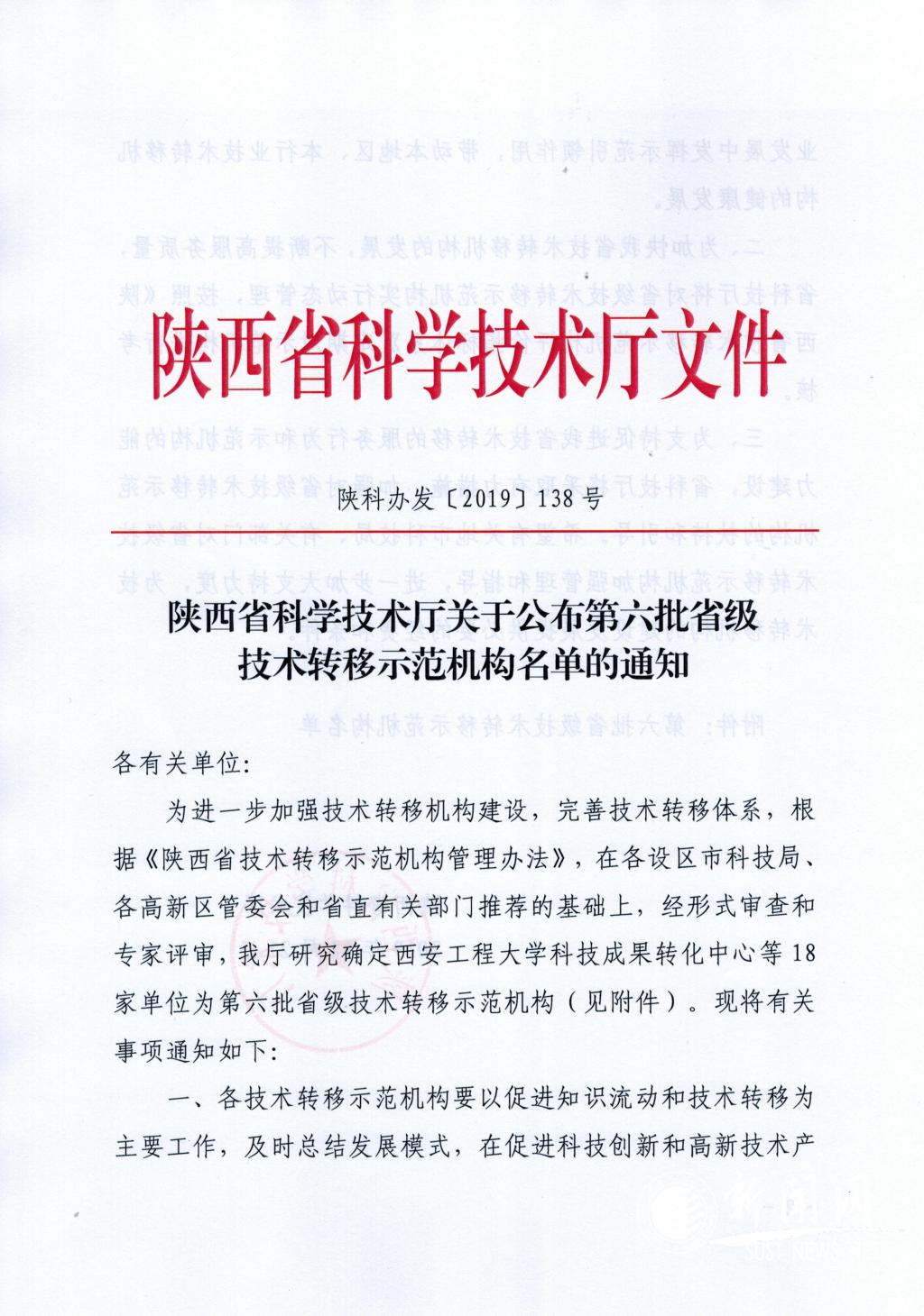 12月23日,陜西省科技廳發(fā)文《關(guān)于公布第六批省級(jí)技術(shù)轉(zhuǎn)移示范機(jī)構(gòu)名單的通知》(陜科辦發(fā)〔2019〕138號(hào)),我校前沿科學(xué)與技術(shù)轉(zhuǎn)移研究院因服務(wù)能力強(qiáng)、業(yè)績顯著獲批陜西省第六批省級(jí)技術(shù)轉(zhuǎn)移示范機(jī)構(gòu)。此舉對(duì)于我校今后進(jìn)一步強(qiáng)化技術(shù)轉(zhuǎn)移服務(wù)效能,提升科研能力和管理水平,更好地促進(jìn)科技成果的轉(zhuǎn)移、轉(zhuǎn)化,充分發(fā)揮省級(jí)技術(shù)轉(zhuǎn)移示范機(jī)構(gòu)的積極帶動(dòng)作用具有十分重要意義。
