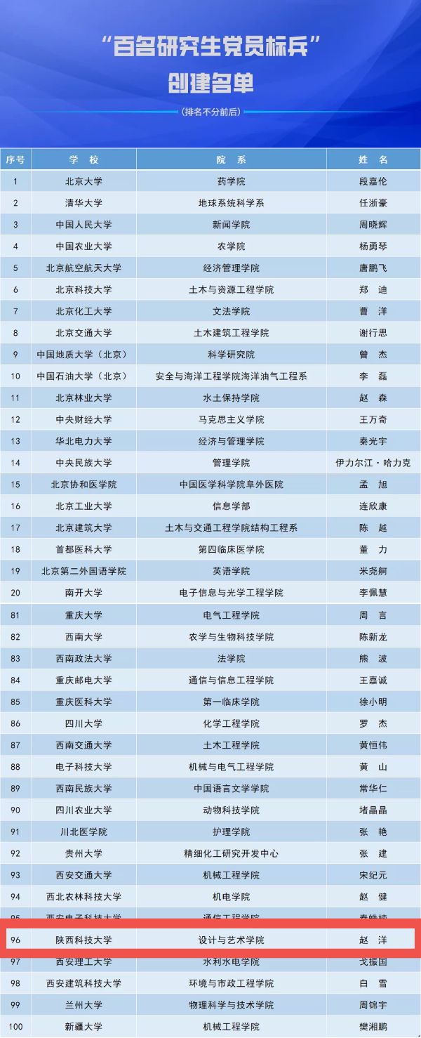 近日,教育部辦公廳公布了全國第二批高?!鞍賯€研究生樣板黨支部”和“百名研究生黨員標兵”創(chuàng)建名單,我校材料學院綠色無機材料創(chuàng)新團隊第二黨支部入選“百個研究生樣板黨支部”,設藝學院2019級博士生趙洋入選“百名研究生黨員標兵”,斬獲研究生黨建全國最高榮譽并取得優(yōu)異成績。