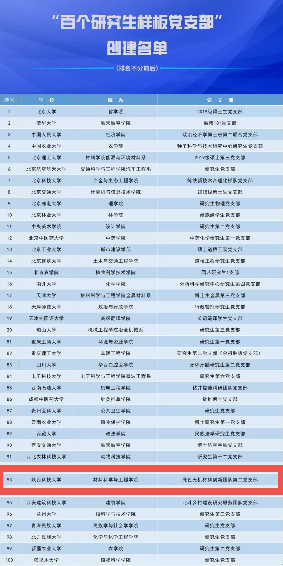 通過兩年來的選拔培育、專家指導、實踐創(chuàng)新、成果積累、校內初評和反復修改,凝結黨校辦、組織部、宣傳部、網(wǎng)絡思政中心、招生辦等校內多部門專家的群策群力,最終綠色無機材料創(chuàng)新團隊第二黨支部和2019級博士研究生趙洋成功入選全國研究生黨建“雙創(chuàng)”名單,取得我校在研究生黨建全國最高榮譽評選中的歷史最好成績。