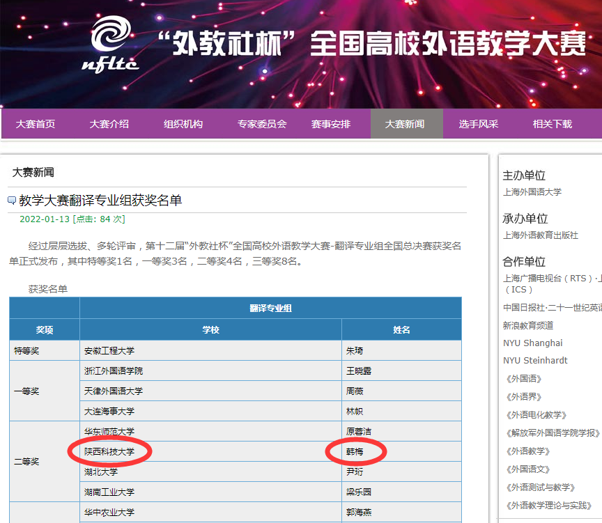 1月13日,第十二屆“外教社杯”全國(guó)高校外語(yǔ)教學(xué)大賽(翻譯專業(yè)組)全國(guó)總決賽落下帷幕,在學(xué)校和學(xué)院的鼓勵(lì)和支持下,我校文理學(xué)院外語(yǔ)系教師韓梅喜獲國(guó)家級(jí)二等獎(jiǎng),創(chuàng)下了我校教師在該項(xiàng)賽事的最好成績(jī)。