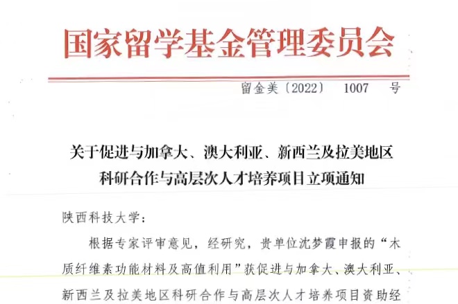 近日,國家留學(xué)基金委公布“促進與加拿大、澳大利亞、新西蘭及拉美地區(qū)科研合作與高層次人才培養(yǎng)項目”評審結(jié)果,我?!澳举|(zhì)纖維素功能材料及高值利用”項目成功獲批,資助經(jīng)費15萬元,此次為我校首次申報該項目并獲批。