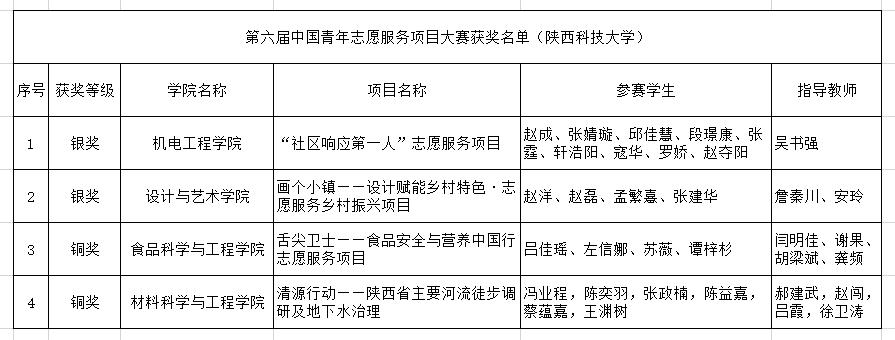 附:第六屆中國青年志愿服務(wù)項(xiàng)目大賽獲獎(jiǎng)名單(陜西科技大學(xué))