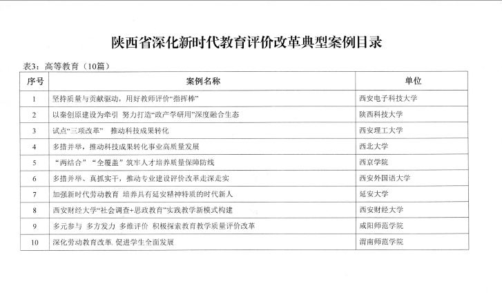 近年來,學(xué)校深入學(xué)習(xí)貫徹習(xí)近平總書記關(guān)于教育的重要論述精神,認(rèn)真落實(shí)中共中央、國(guó)務(wù)院印發(fā)的《深化新時(shí)代教育評(píng)價(jià)改革總體方案》及陜西省《貫徹落實(shí)<深化新時(shí)代教育評(píng)價(jià)改革總體方案>若干措施》要求,圍繞學(xué)科建設(shè)、人才培養(yǎng)、科學(xué)研究、社會(huì)服務(wù)以及教師評(píng)價(jià)等方面的工作,全面落實(shí)新時(shí)代教育評(píng)價(jià)改革要求,不斷推動(dòng)學(xué)校內(nèi)涵建設(shè),學(xué)校事業(yè)取得了快速發(fā)展和長(zhǎng)足進(jìn)步。特別是獲批全省教育評(píng)價(jià)改革試點(diǎn)單位以來,學(xué)校依托自身特色學(xué)科和人才優(yōu)勢(shì),推動(dòng)融入秦創(chuàng)原平臺(tái)建設(shè)落地落實(shí),促進(jìn)人才鏈、創(chuàng)新鏈、產(chǎn)業(yè)鏈精準(zhǔn)對(duì)接,積極探索科技成果轉(zhuǎn)化新機(jī)制、新模式,全力服務(wù)陜西經(jīng)濟(jì)社會(huì)發(fā)展。