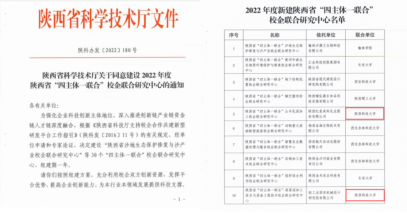 近日,陜西省科技廳發(fā)布《關(guān)于同意建設(shè)2022年度陜西省“四主體一聯(lián)合”校企聯(lián)合研究中心的通知》,由我校食品科學(xué)與工程學(xué)院舒國偉教授與陜西紅星美羚乳業(yè)股份有限公司聯(lián)合申報(bào)的山羊乳深加工校企聯(lián)合研究中心、機(jī)電工程學(xué)院董繼先教授與輕工業(yè)西安機(jī)械設(shè)計(jì)研究院有限公司聯(lián)合申報(bào)的茯茶深加工技術(shù)與裝備工程技術(shù)校企聯(lián)合研究中心均成功獲批。我校是全省15家獲批此次校企聯(lián)合研究中心的高校之一,這也是我校首次同一年度獲批2項(xiàng)校企聯(lián)合研究中心。