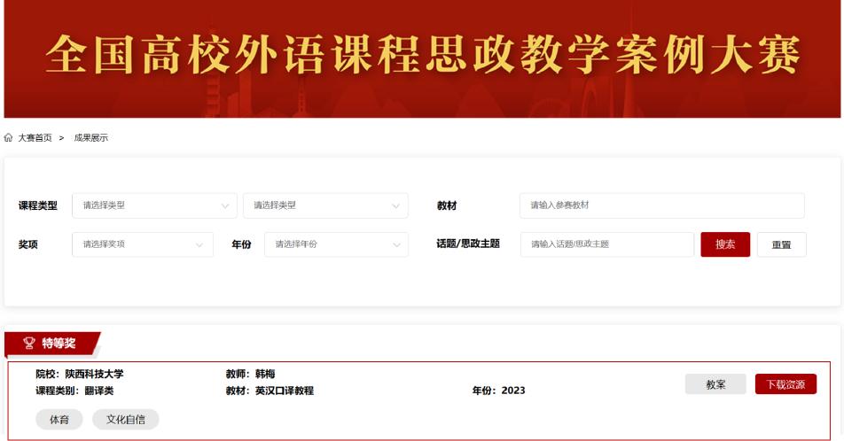 參賽教師的教案以及思政案例素材都已在HEEP高等英語教學(xué)網(wǎng)教學(xué)資源庫上線,支持按照育人思想與話題關(guān)鍵詞進(jìn)行搜索,供全國教師免費(fèi)下載。