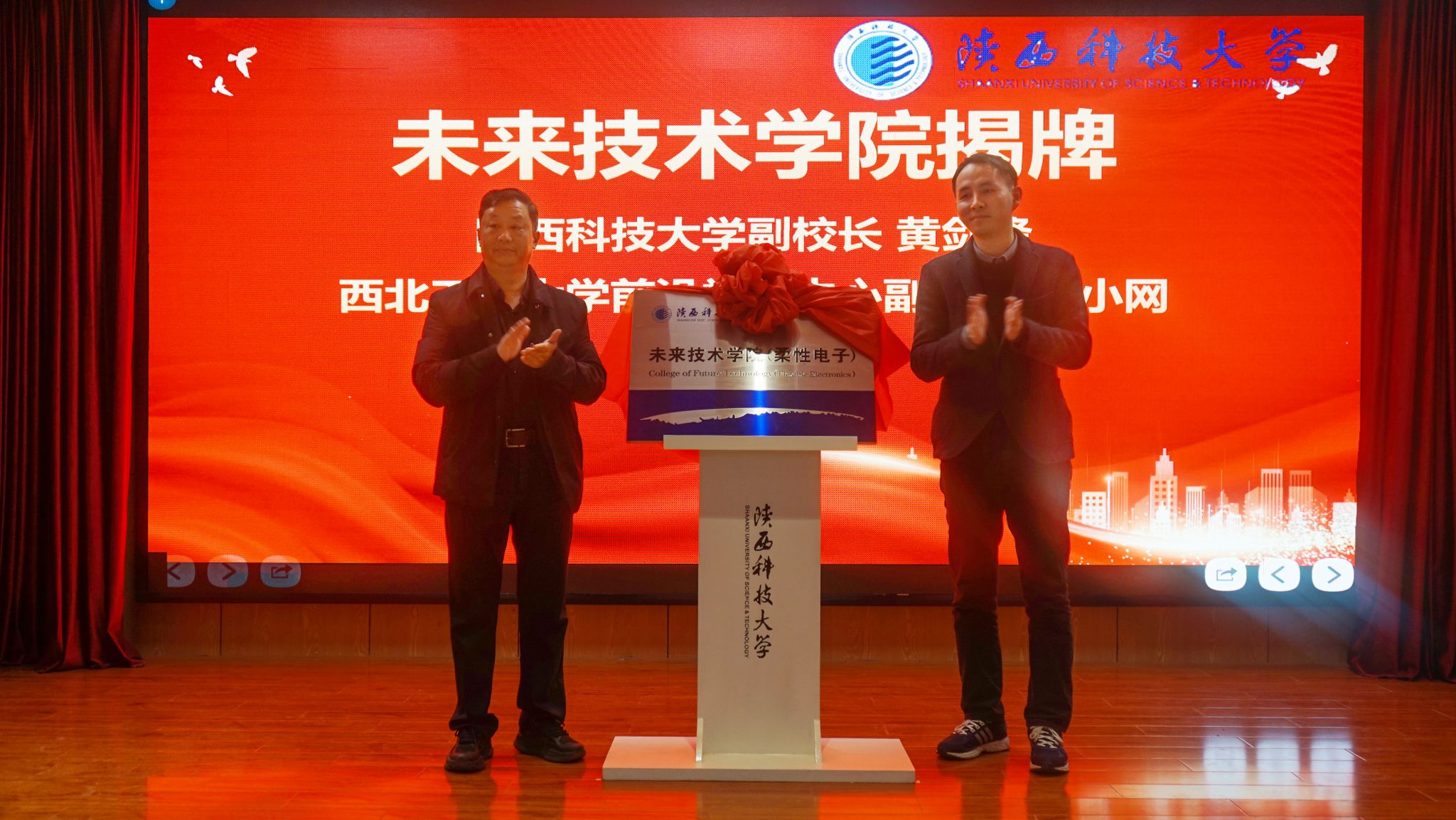 12月6日,未來技術(shù)學(xué)院本碩博貫通式人才培養(yǎng)開班儀式在實(shí)驗(yàn)樓1B-112會(huì)議室舉行。副校長(zhǎng)黃劍鋒、蒲永平出席儀式,西北工業(yè)大學(xué)柔性電子前沿科學(xué)中心副主任劉小網(wǎng)教授到會(huì)祝賀并與黃劍鋒共同為未來技術(shù)學(xué)院揭牌。研究生院主要負(fù)責(zé)人,輕工科學(xué)與工程學(xué)院(柔性電子學(xué)院)班子成員、本碩博班博士生導(dǎo)師、學(xué)院教師代表以及本碩博231班全體同學(xué)參加了開班儀式。