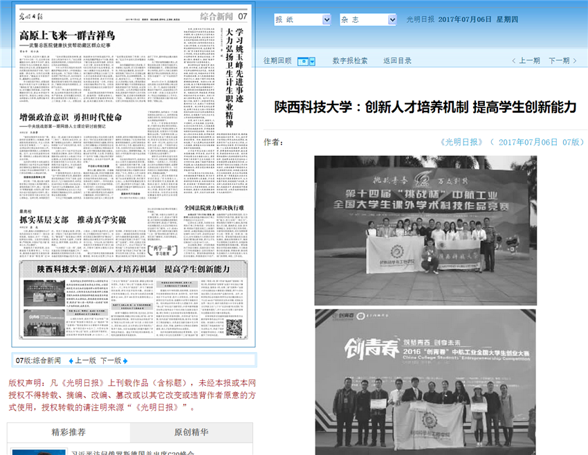 《光明日?qǐng)?bào)》7月6日7版以《陜西科技大學(xué):創(chuàng)新培養(yǎng)機(jī)制 提高學(xué)生創(chuàng)新能力》為題,報(bào)道了我校材料科學(xué)與工程學(xué)院作為陜西省創(chuàng)新創(chuàng)業(yè)教育改革試點(diǎn)學(xué)院,以國(guó)家級(jí)特色專業(yè)無(wú)機(jī)非金屬材料工程等材料類專業(yè)為試點(diǎn),以陜西省無(wú)機(jī)非金屬材料工程教學(xué)團(tuán)隊(duì)和陜西省陶瓷材料綠色制造重點(diǎn)科技創(chuàng)新團(tuán)隊(duì)為主要依托,持續(xù)推進(jìn)創(chuàng)新創(chuàng)業(yè)教育,探索出 “核心層-吸附層-流動(dòng)層”創(chuàng)新人才培養(yǎng)機(jī)制,成果斐然。全文轉(zhuǎn)載如下: