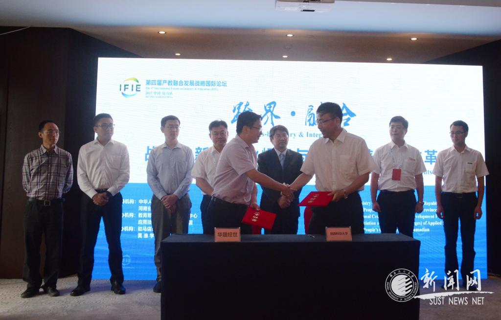6月23至24日,由教育部學(xué)校規(guī)劃建設(shè)發(fā)展中心、應(yīng)用技術(shù)大學(xué)(學(xué)院)聯(lián)盟主辦的第四屆產(chǎn)教融合發(fā)展戰(zhàn)略國際論壇在駐馬店市嵖岈山國際會(huì)議中心舉行。我校副校長郭霄鵬一行參加論壇,并簽訂了《互聯(lián)網(wǎng)+中國制造2025產(chǎn)教融合創(chuàng)新基地合作協(xié)議》。