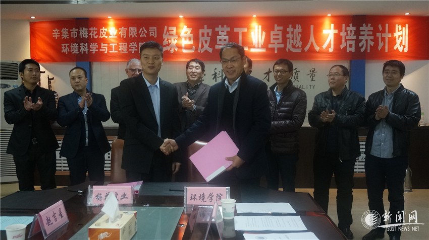 11月17日,環(huán)境科學與工程學院與辛集市梅花皮業(yè)有限公司共同舉辦的“綠色皮革工業(yè)卓越人才培養(yǎng)計劃”簽約儀式在1B312會議室舉行。梅花皮業(yè)總經(jīng)理董賀翔、研發(fā)技術(shù)總工Daniel、企管部經(jīng)理羅恒一、趙吉星,環(huán)境學院全體黨政領(lǐng)導、教師代表、輔導員及學生代表參加了簽約儀式。會議中環(huán)境學院首項企業(yè)獎學金——“梅花獎學金”正式誕生。