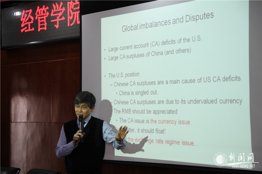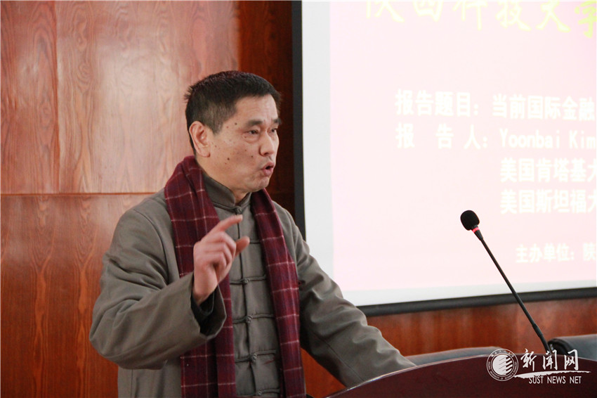 由經(jīng)濟與管理學(xué)院主辦、國際合作與交流處聯(lián)辦的陜西科技大學(xué)“未央論壇”于11月23日上午在經(jīng)管學(xué)院學(xué)術(shù)報告廳舉行,美國斯坦福大學(xué)博士、肯塔基大學(xué)經(jīng)濟學(xué)系金潤培(Yoonbai Kim)教授受邀為廣大教師和研究生作了題為“當前國際金融與宏觀經(jīng)濟學(xué)問題”的學(xué)術(shù)報告,論壇由經(jīng)管學(xué)院院長馬廣奇主持。