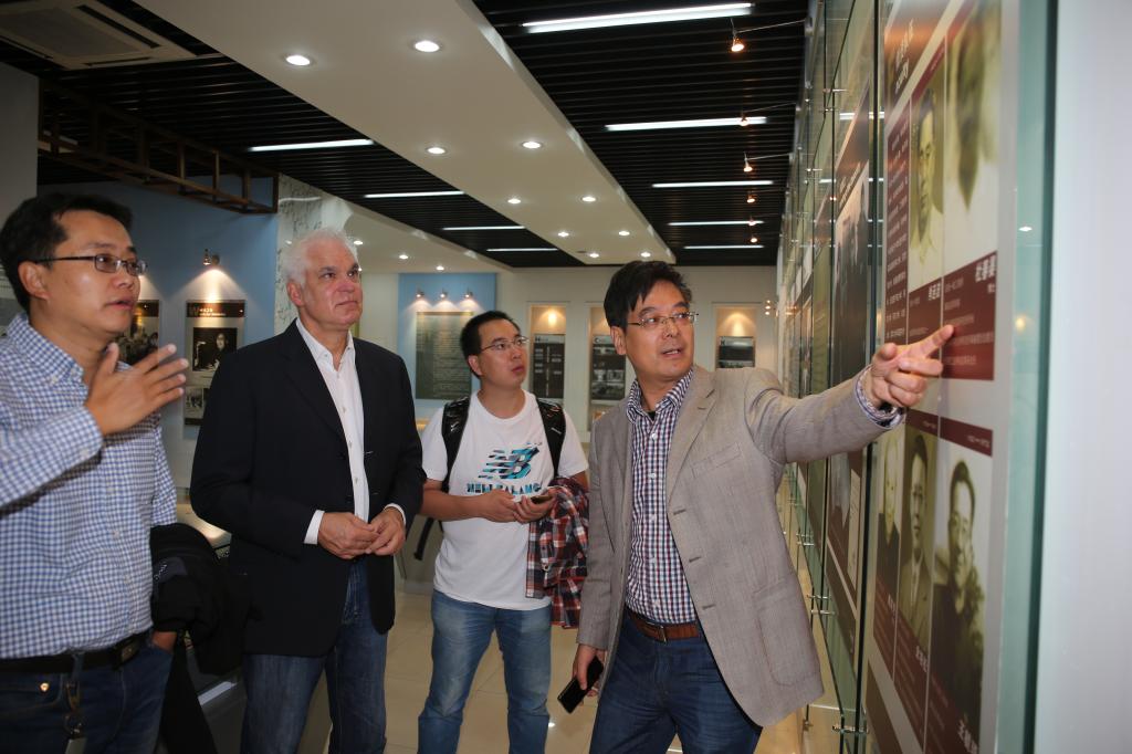 副校長(zhǎng)王學(xué)川(右一)等陪同Matthias Scholl一行參觀校史館