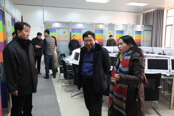 省教育廳語言文字工作處副處長劉白燕(右一)在副校長姚書志(右二)等陪同下在我校計(jì)算機(jī)輔助普通話水平測試站現(xiàn)場考察