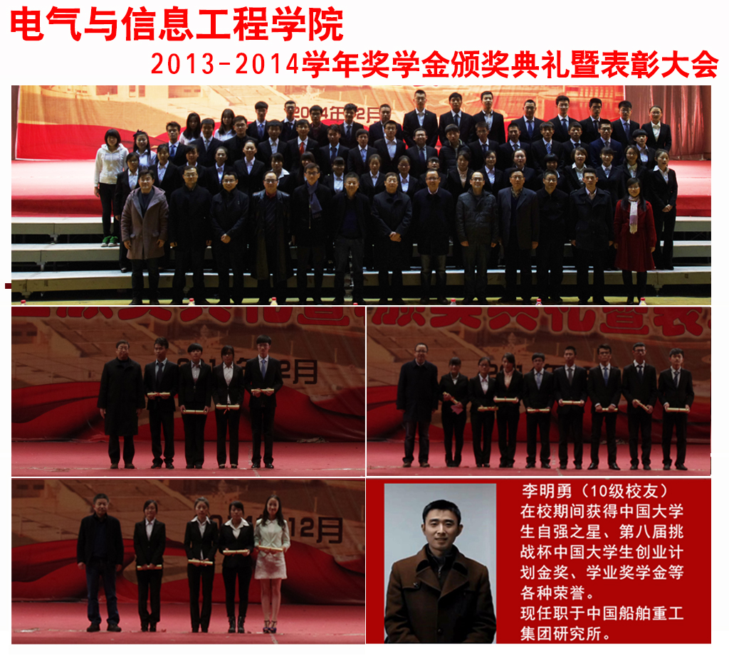 12月23日晚,電氣與信息工程學(xué)院2013-2014學(xué)年獎學(xué)金頒獎典禮暨表彰大會在文體館隆重舉行,此次典禮是電信學(xué)院自2010年以來第5年舉行。相比歷屆獎學(xué)金頒獎典禮,最大的特點是曾經(jīng)在舞臺上領(lǐng)過獎的08、09、10級三屆共6名優(yōu)秀校友,不忘母校情,通過視頻對學(xué)生表達真情。