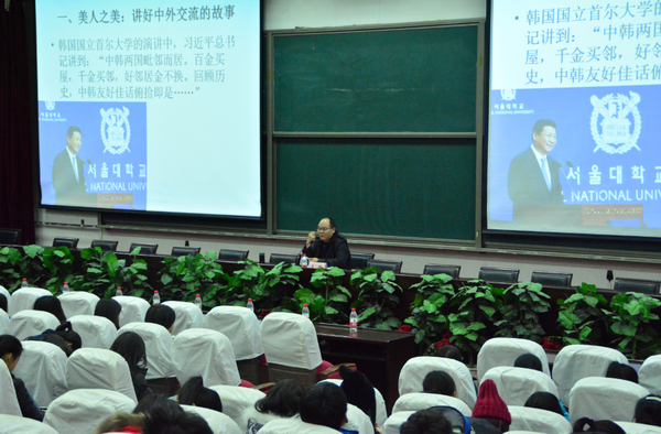 當晚報告開始前,王強教授與到場師生一同回顧了習近平總書記在首爾大學的演講,隨后以習近平總書記的精彩演講為例,拉開了學術報告的序幕。