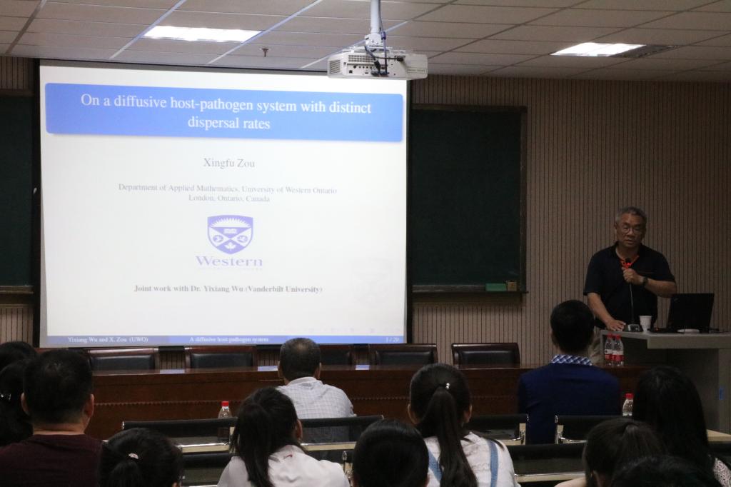 6月12號,來自加拿大西安大略大學(xué)(University of Western Ontario)的博士生導(dǎo)師鄒幸福教授應(yīng)邀來校做了“具有不同分散速率和空間異質(zhì)性的一類反應(yīng)擴(kuò)散宿主--病原體系統(tǒng)的研究”學(xué)術(shù)報告。報告由文理學(xué)院院長藺小林教授主持,參加學(xué)術(shù)報告的有文理學(xué)院數(shù)學(xué)系中青年教師、碩士研究生導(dǎo)師、研究生、以及本科生等。