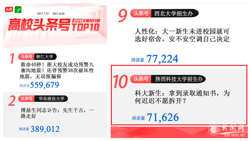 教育部與“今日頭條”官方出具的榜單中,不論是頭條號(hào)還是文章質(zhì)量我校都位居前列。這是因?yàn)槲倚U猩k頭條號(hào)緊抓高考熱點(diǎn),精心設(shè)計(jì)編輯,在招生咨詢、招生錄取和迎新工作等各環(huán)節(jié),總是及時(shí)發(fā)布最新的招考資訊及學(xué)校信息,使得考生和家長(zhǎng)能夠第一時(shí)間獲取和了解。如《國(guó)務(wù)院首批88所重點(diǎn)大學(xué),從北京輾轉(zhuǎn)西安,輕工專業(yè)國(guó)內(nèi)頂尖》、《陜西科技大學(xué)2017年在陜招生計(jì)劃》、《西安高校豪華餐廳:咖啡、桌球、娃娃機(jī)、籃球機(jī)齊聚一堂》等十余篇文章閱讀量、推薦量過萬。單篇文章《科大新生:拿到錄取通知書,為何遲遲不愿拆開?》閱讀量超過7萬,進(jìn)入“高校頭條號(hào)8月文章排行榜TOP10”。