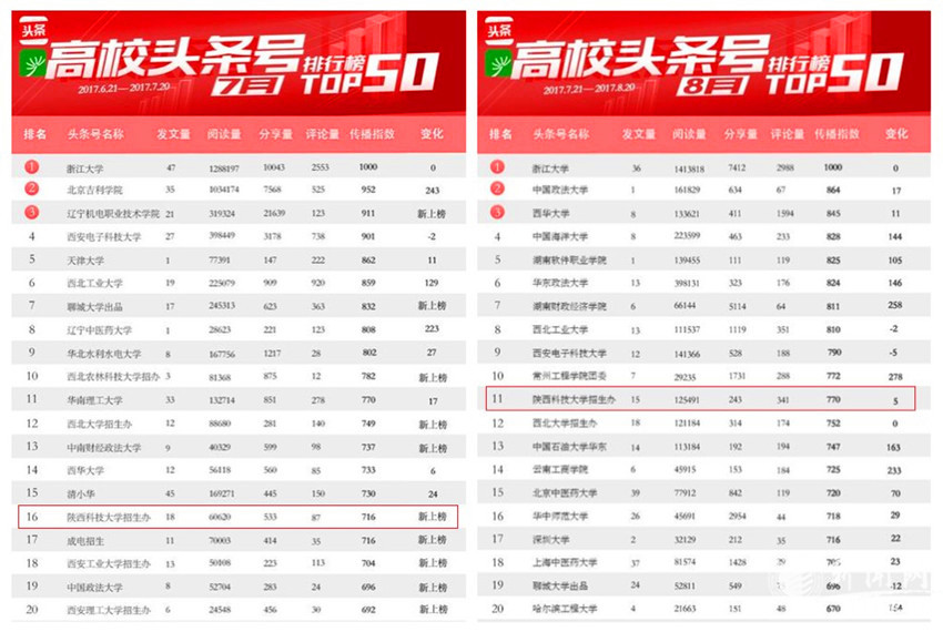 在教育部頭條號(hào)微言教育聯(lián)合“今日頭條”官方評(píng)選的榜單中,“陜西科技大學(xué)招生辦”頭條號(hào),8月位列全國(guó)高校同類頭條號(hào)排名第一名,7月位列全國(guó)第三名;在全國(guó)高校優(yōu)質(zhì)頭條號(hào)7月榜單TOP50中位列第16名,8月榜單TOP50中位列第11名。