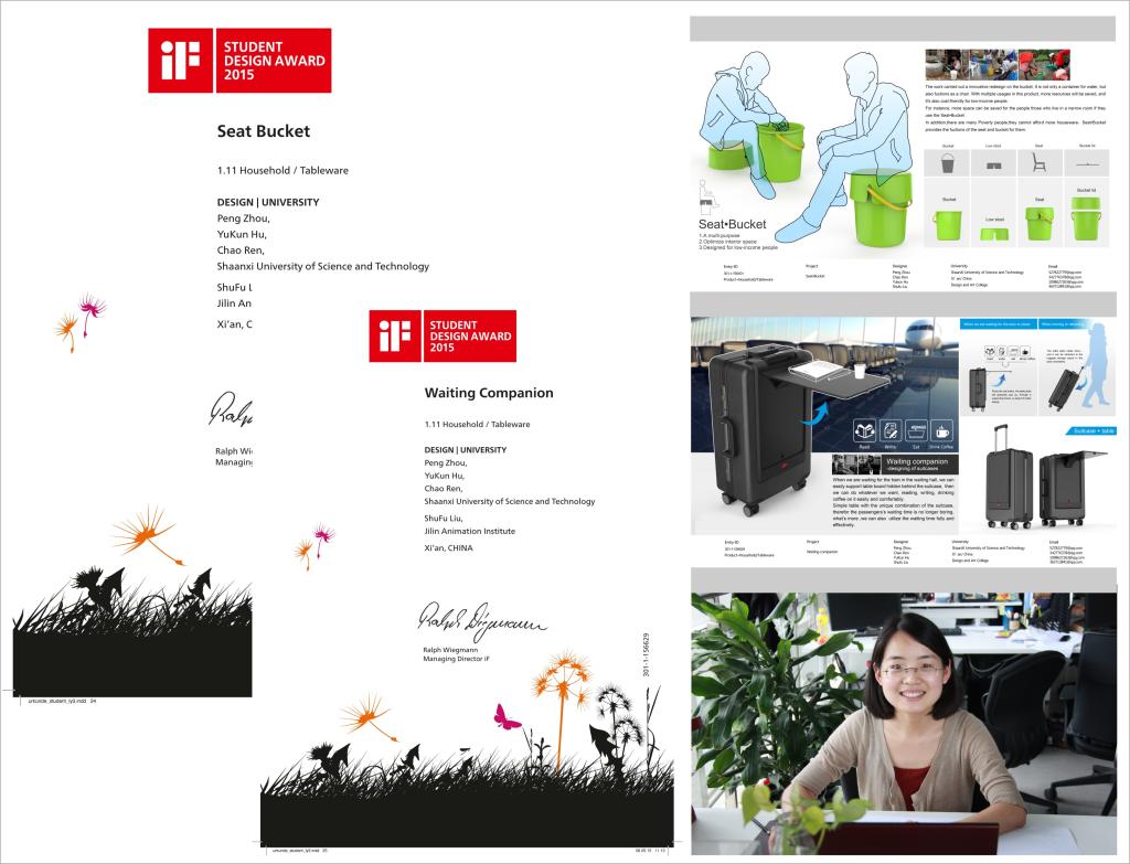 2015德國(guó)IF學(xué)生設(shè)計(jì)競(jìng)賽獲獎(jiǎng)結(jié)果公布,我校設(shè)計(jì)與藝術(shù)學(xué)院2013級(jí)設(shè)計(jì)學(xué)研究生胡宇坤作為第一設(shè)計(jì)人、與實(shí)習(xí)單位共同完成的兩項(xiàng)作品《Seat Bucket》、《Waiting Companion》從全球近12000件學(xué)生概念作品中脫穎而出,喜獲“2015年IF學(xué)生設(shè)計(jì)獎(jiǎng)”。