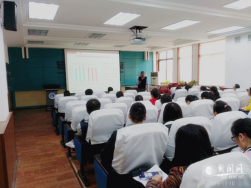 實驗樓1B318他為在座學生作了題為“高溫預水解結合機械磨漿用于木質纖維及木素生產(chǎn)高值化產(chǎn)品”的學術報告。本場報告會由輕工科學與工程學院副院長張素風教授主持,為我?!皩熣搲毕盗袑W術報告。報告中,漢森·嘉米爾(Hasan Jameel)教授首先介紹了生物質精煉的內涵、發(fā)展及前景,主要從燃料乙醇與生物柴油轉化,琥珀酸、糠醛、羥甲基糠醛等高附加值化學品轉化,以及木素基膠黏劑與泡沫材料等方面進行了詳細闡述。他重點講述了高溫預水解結合機械法磨漿預處理在生物質精煉中的重要性與優(yōu)勢,其優(yōu)勢在于綠色環(huán)保性、低成本、弱腐蝕性、與酸預處理相比具有較少的降解產(chǎn)物、無硫殘余物(木素),有利于高附加值產(chǎn)品轉化等。隨后他又闡述了由于成本較高導致木質纖維素轉化乙醇此路線受制約的問題,因此未來需要將預處理后所得木聚糖、纖維素、木素等進行分離分級,進而轉化為不同化學品材料,如木材膠黏劑、泡沫材料等。