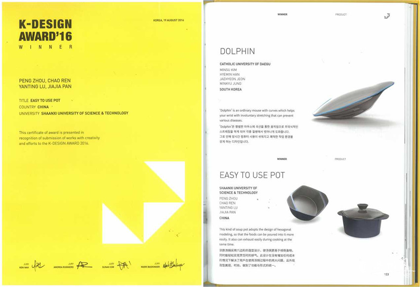 近日,2016韓國(guó)K-DESIGN國(guó)際設(shè)計(jì)獎(jiǎng)評(píng)獎(jiǎng)結(jié)果公布,我校設(shè)計(jì)與藝術(shù)學(xué)院2014級(jí)藝術(shù)設(shè)計(jì)研究生魯燕婷(導(dǎo)師:楊曉燕)在實(shí)習(xí)單位完成的作品《EASY TO USE POT》喜獲“Winner Award’2016”獎(jiǎng)項(xiàng)。由此,我校成為第一獲獎(jiǎng)單位。