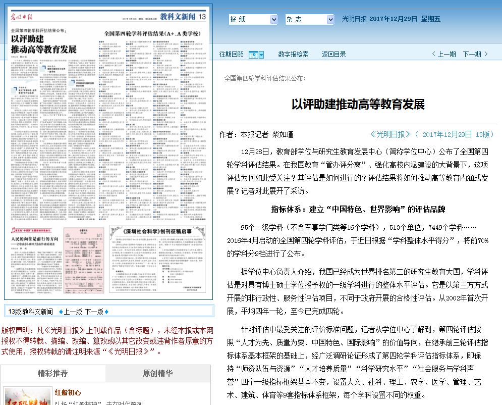 2017年12月28日,教育部學(xué)位與研究生教育發(fā)展中心公布了全國第四輪學(xué)科評估結(jié)果。29日,光明日報(bào)記者發(fā)表了《 全國第四輪學(xué)科評估結(jié)果公布:以評助建推動高等教育發(fā)展》的文章,全文轉(zhuǎn)載如下: