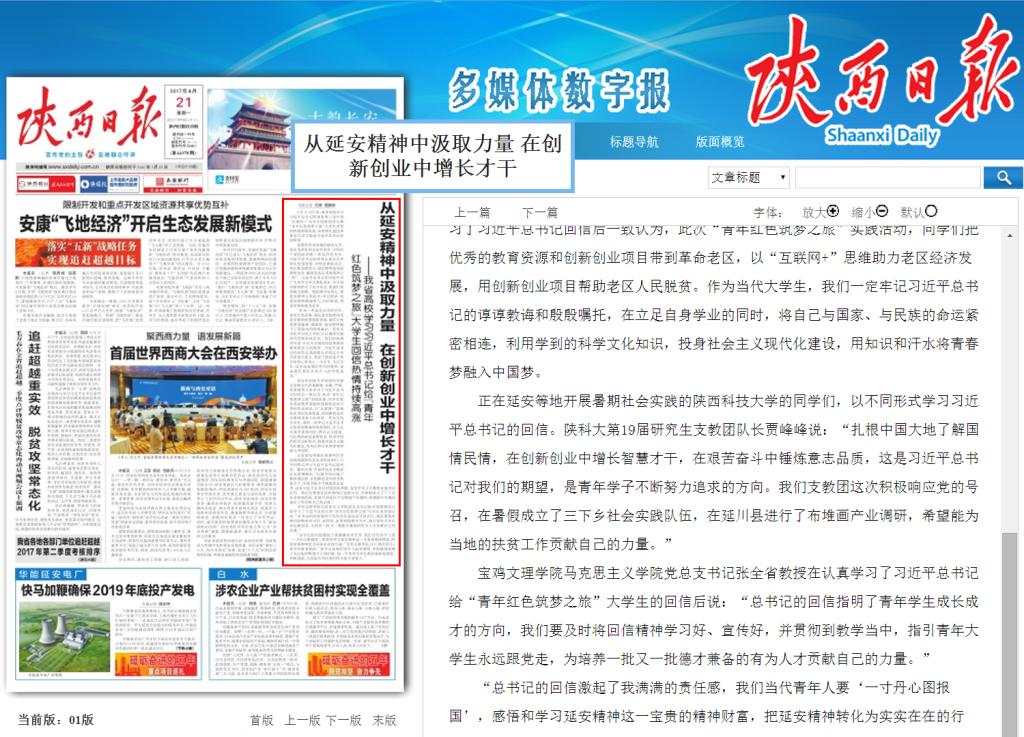8月21日,《陜西日報》要聞版以“從延安精神中汲取力量 在創(chuàng)新創(chuàng)業(yè)中增長才干”為題,在《我省高校學(xué)習(xí)習(xí)近平總書記給“青年紅色筑夢之旅”大學(xué)生回信熱情持續(xù)高漲》系列報道中,報道了陜西科技大學(xué)青年學(xué)子以不同形式學(xué)習(xí)習(xí)近平總書記的回信。