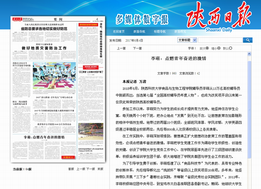 陜西日報6月4日4版“要聞”以《李萌:點燃青年奮進的激情》為題,報道我校優(yōu)秀輔導員李萌入選3月“中國好人榜”“敬業(yè)奉獻好人”的先進事跡。“中國好人榜”評議活動由中央文明辦主辦、中國文明網承辦。此前,李萌被評為陜西省2015年11-12月“陜西好人榜”“敬業(yè)奉獻類”“陜西好人”。