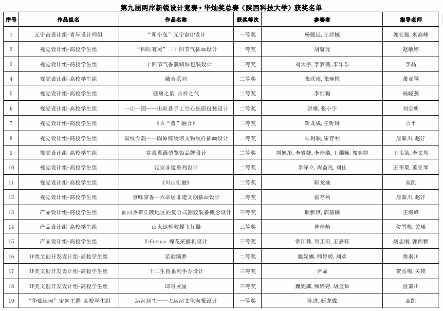 12月4日,華燦獎組委員公布了第九屆兩岸新銳設(shè)計競賽·華燦獎全國賽的最終獲獎名單。第九屆兩岸新銳設(shè)計競賽·華燦獎由中國高等教育學(xué)會、中華中山文化交流協(xié)會、北京歌華傳媒集團(tuán)有限責(zé)任公司主辦,自2024年4月啟動以來經(jīng)過5個月的作品征集,共收到7萬余件參賽作品。經(jīng)校賽、賽區(qū)賽評審、總賽網(wǎng)絡(luò)評審、現(xiàn)場評審及公示,本屆華燦獎34個賽區(qū)共評選出全國賽獲獎作品2749項,陜西科技大學(xué)在本次競賽中獲獎19項(其中一等獎3項,二等獎11項,三等獎5項),取得了自參加華燦獎以來的最好成績。