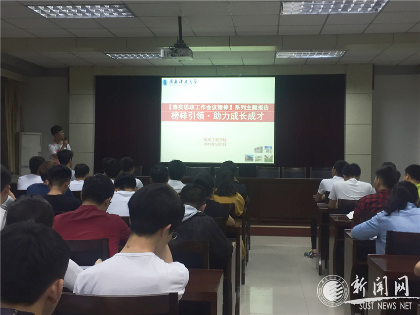 召開(kāi)思政主題報(bào)告會(huì),專項(xiàng)工作聯(lián)動(dòng)育人。為了將學(xué)校思政工作會(huì)議精神化作立德樹(shù)人的實(shí)效,機(jī)電學(xué)院推出系列主題報(bào)告會(huì),活動(dòng)以與學(xué)生在校學(xué)習(xí)生活密切相關(guān)的內(nèi)容為主旨,凝練方向,將相繼開(kāi)展職業(yè)引領(lǐng)、專業(yè)引領(lǐng)、育心引領(lǐng)、思想引領(lǐng)、榜樣引領(lǐng)等五大主題報(bào)告,幫助學(xué)生廓清大學(xué)學(xué)習(xí)生活中的認(rèn)識(shí)、化解日常學(xué)習(xí)生活中的困難、祛除青年成長(zhǎng)發(fā)展中的煩惱,助力學(xué)生成長(zhǎng)成才,努力實(shí)現(xiàn)思政育人的最終目標(biāo)。4月26日舉行了活動(dòng)啟動(dòng)儀式暨首場(chǎng)報(bào)告會(huì),邀請(qǐng)學(xué)校就業(yè)指導(dǎo)中心就業(yè)創(chuàng)業(yè)部主任羅曉婷作了《大學(xué)是道選擇題——大學(xué)生的出路》主題報(bào)告,2017級(jí)各專業(yè)300余名學(xué)生參加。報(bào)告會(huì)圍繞大學(xué)生職業(yè)生涯規(guī)劃要素與階段,通過(guò)深入淺出地講解,強(qiáng)調(diào)“生涯之道在于應(yīng)變之道”,引導(dǎo)學(xué)生志存高遠(yuǎn)、腳踏實(shí)地。5月1日,面向部分預(yù)備黨員、2016和2017級(jí)全體班長(zhǎng),邀請(qǐng)優(yōu)秀學(xué)生黨員代表作了《榜樣引領(lǐng)·助力成長(zhǎng)成才》主題報(bào)告,報(bào)告人圍繞自身學(xué)習(xí)生活實(shí)際、如何立足崗位做奉獻(xiàn)進(jìn)行了交流。