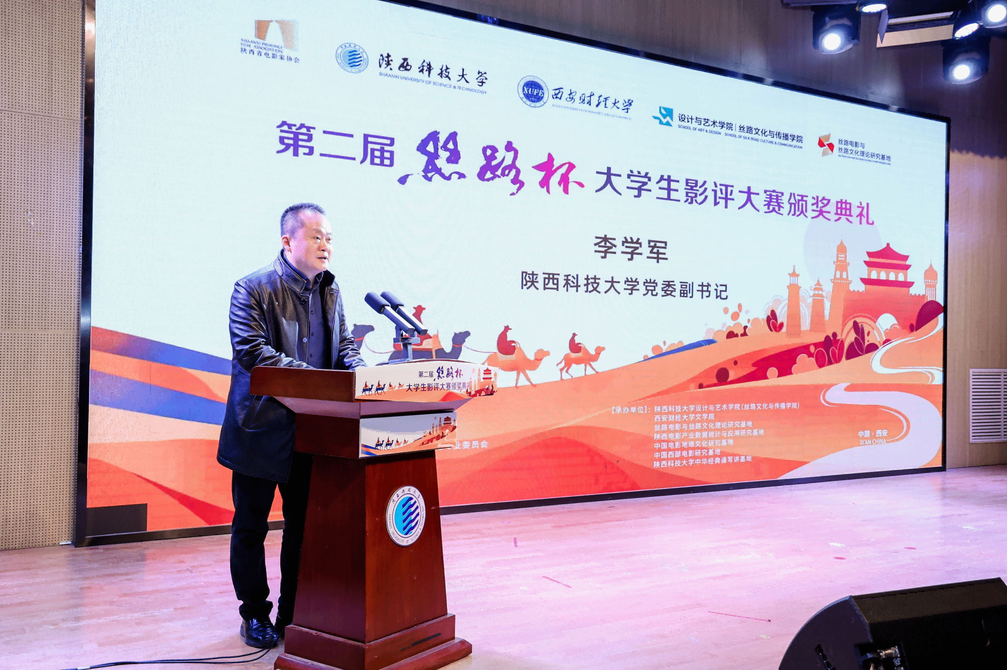 李學(xué)軍在致辭中對(duì)與會(huì)的各位領(lǐng)導(dǎo)、老師和同學(xué)們表示熱烈的歡迎,并簡要介紹了學(xué)校教育事業(yè)近年來的發(fā)展情況,重點(diǎn)介紹了設(shè)計(jì)學(xué)科的發(fā)展情況。他表示,絲路影評(píng)大賽作為文化校園建設(shè)的重要平臺(tái)和第二課堂的重要載體,對(duì)引領(lǐng)學(xué)進(jìn)一步堅(jiān)定理想信念,激發(fā)愛國情懷具有重要意義,希望大賽的持續(xù)舉辦,逐步成為豐富文化校園的品牌活動(dòng),進(jìn)一步引領(lǐng)師生堅(jiān)定文化自信、講好中國故事,為助力文化強(qiáng)國建設(shè)做出新的重大貢獻(xiàn)。他希望,同學(xué)們秉持有深度、有溫度的創(chuàng)作情懷,一如既往的關(guān)注國家發(fā)展,關(guān)切民族文化,創(chuàng)作出緊跟時(shí)代步伐,深入生活一線,扎根人民群眾的影評(píng)作品,讓時(shí)代傾聽當(dāng)代大學(xué)生的聲音。