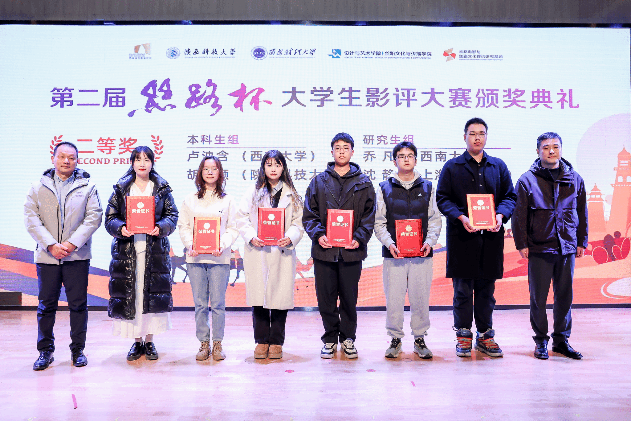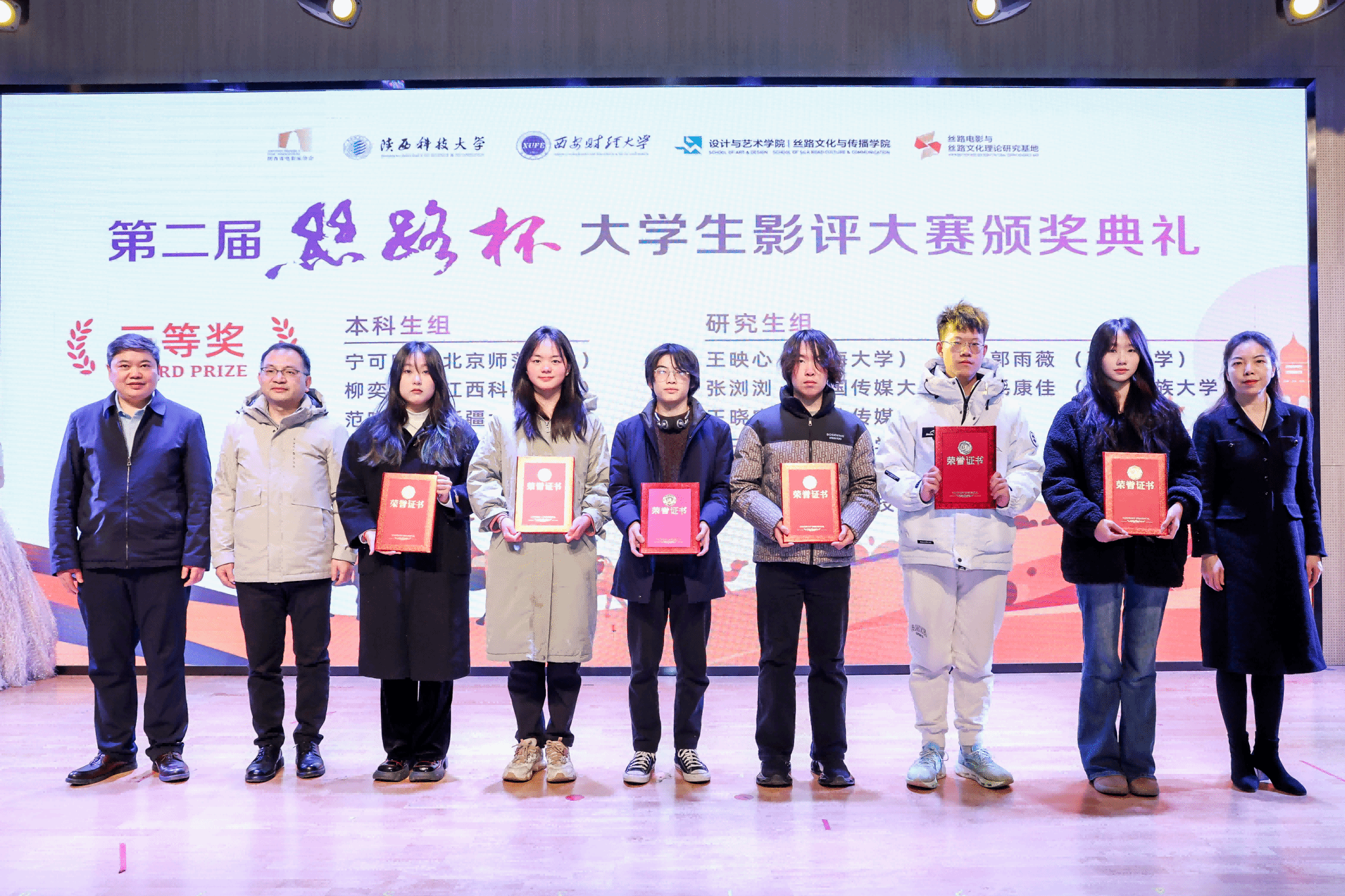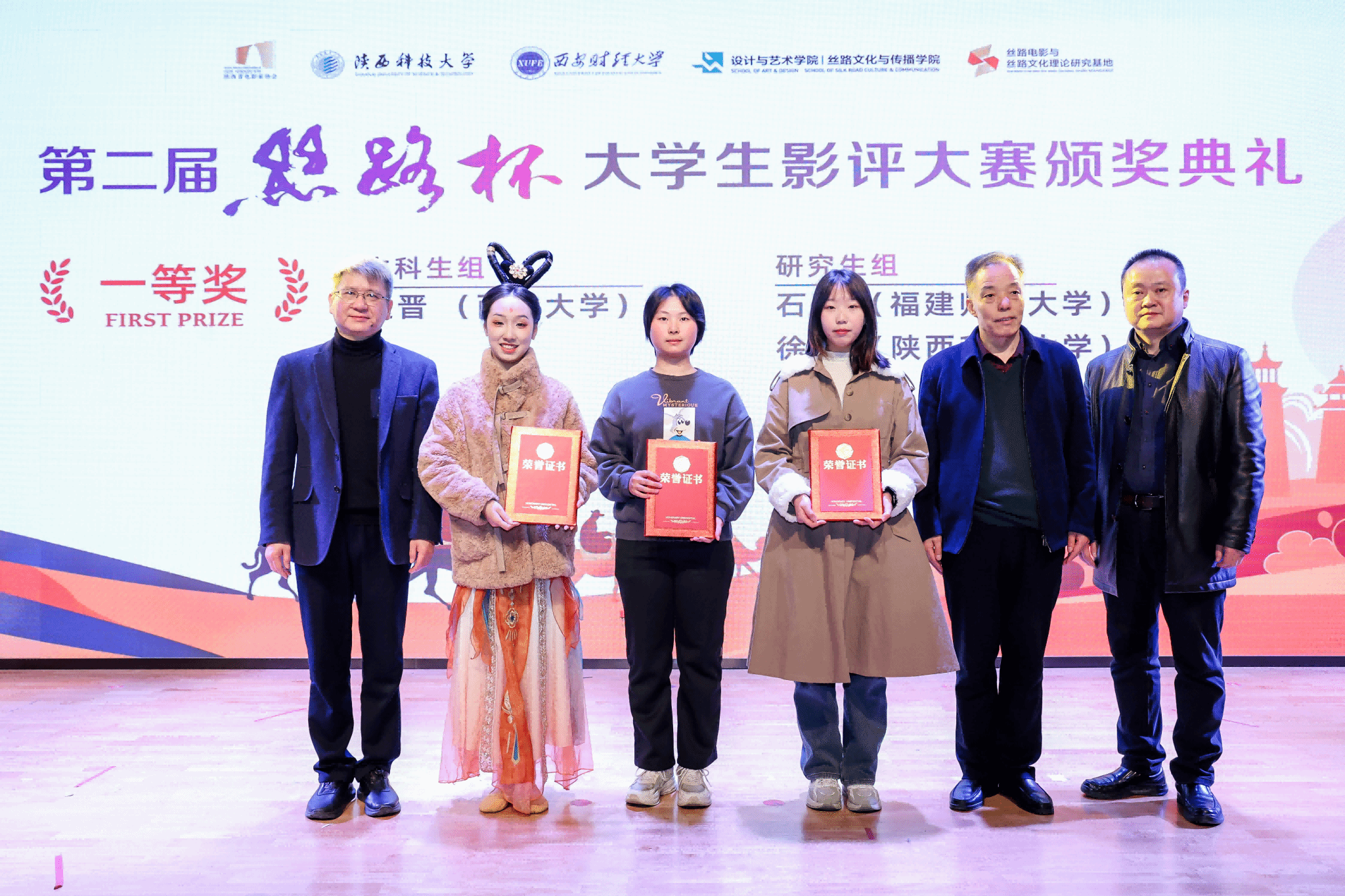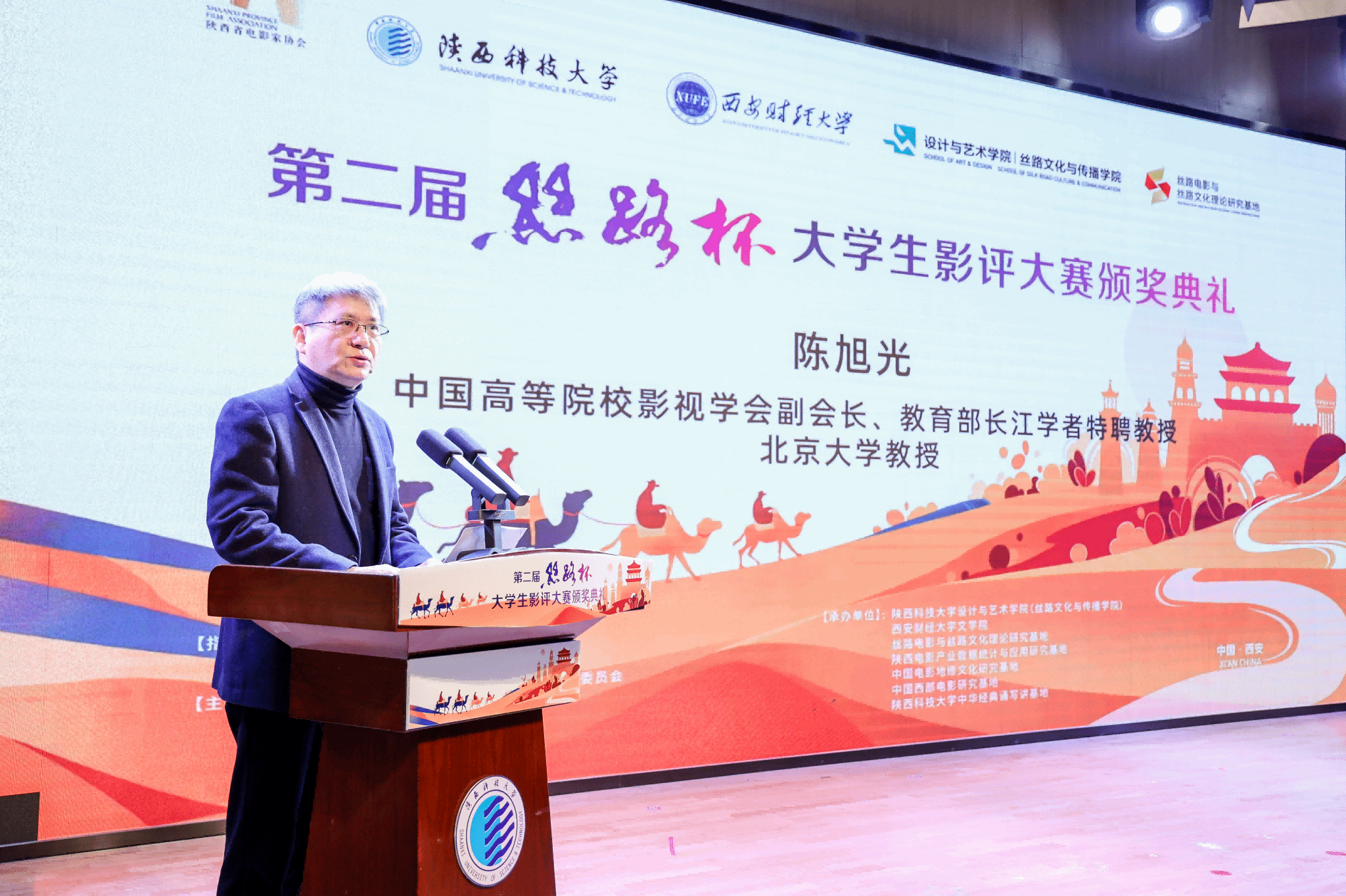 12月17日下午,“第二屆‘絲路杯’全國大學(xué)生影評(píng)大賽”頒獎(jiǎng)典禮在我校舉行。陜西科技大學(xué)黨委副書記李學(xué)軍,中國高等院校影視學(xué)會(huì)副會(huì)長、教育部長江學(xué)者特聘教授、北京大學(xué)教授陳旭光,西安財(cái)經(jīng)大學(xué)副校長傅彤、中共陜西省委宣傳部電影處副處長李曉楠,西安曲江影視集團(tuán)總經(jīng)理李珂,陜西省電影家協(xié)會(huì)副主席張東靈等出席并頒獎(jiǎng)。