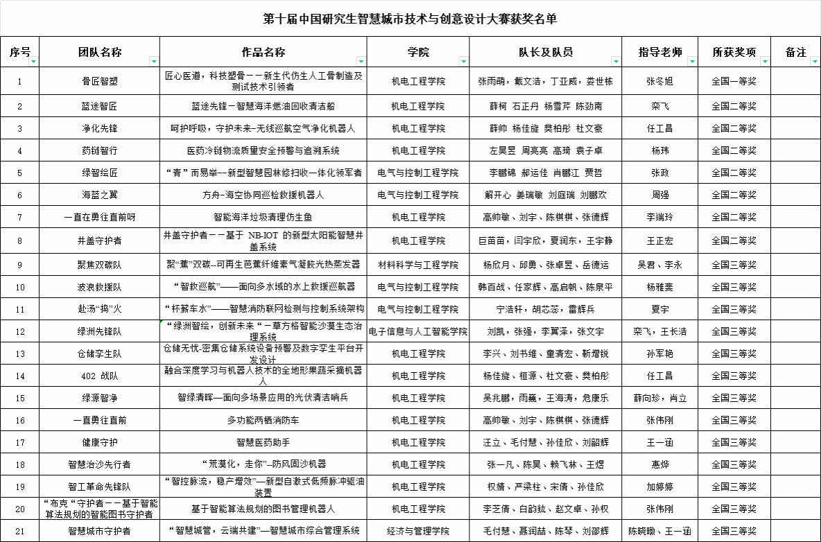 12月11日至13日,由教育部學(xué)位管理與研究生教育司指導(dǎo)、中國學(xué)位與研究生教育學(xué)會和中國科協(xié)青少年科技中心聯(lián)合主辦的第十屆中國研究生智慧城市技術(shù)與創(chuàng)意設(shè)計(jì)大賽決賽在重慶大學(xué)舉行。我校參賽隊(duì)伍經(jīng)過激烈比拼,最終有21項(xiàng)作品榮獲國家級獎項(xiàng),其中1項(xiàng)作品榮獲全國一等獎,7項(xiàng)作品榮獲全國二等獎,13項(xiàng)作品榮獲全國三等獎,獲獎等級和數(shù)量均創(chuàng)歷史新高。學(xué)校榮獲高校優(yōu)秀組織單位獎,機(jī)電工程學(xué)院張冬旭獲優(yōu)秀指導(dǎo)教師稱號。