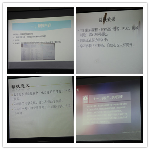 “一對一結(jié)對幫扶”活動第二階段中期檢查答辯會于五月尾召開。學(xué)院全體學(xué)生黨員就近期結(jié)對幫扶進展情況以PPT的形式進行答辯,答辯人員從幫扶內(nèi)容、幫扶效果、幫扶意義三個方面進行闡述,著重體現(xiàn)幫扶效果。經(jīng)過兩個多月的幫扶工作,“一對一結(jié)對幫扶”活動已初見成效。有的幫扶對象在黨員的幫扶下,圍繞英語四六級制定了適合自己的學(xué)習(xí)方案,針對薄弱環(huán)節(jié)進行專項訓(xùn)練,努力提升英語綜合水平以備戰(zhàn)即將到來的等級考試;有的幫扶對象在黨員的學(xué)業(yè)指導(dǎo)下,一改過去自由散漫的生活狀態(tài),學(xué)習(xí)成績有了很大的提高,在補考中取得了好成績,畢業(yè)生的畢業(yè)設(shè)計也能夠較好的跟上進度;論文及專利的撰寫是研究生具備一定科研能力的體現(xiàn),通過結(jié)對幫扶,幫扶對象在論文發(fā)表及專利申請上均有成果展現(xiàn),個人科研能力也得到了提升。機電學(xué)院2013級學(xué)生黨支部黨員任曉明說: “我只是在用我自身的能力去幫助周圍的同學(xué),希望自己的這種能量能夠傳遞給更多的人,如果能夠起到作用,幫助他人的同時自身價值也得到了體現(xiàn),這讓我覺得很有意義?!睅头鰧ο筇其撜f:“我在黨員的幫扶下,一直督促自身改掉以前的懶惰習(xí)慣,今年的補考全部通過,現(xiàn)在感覺又有信心啦?!?/p>