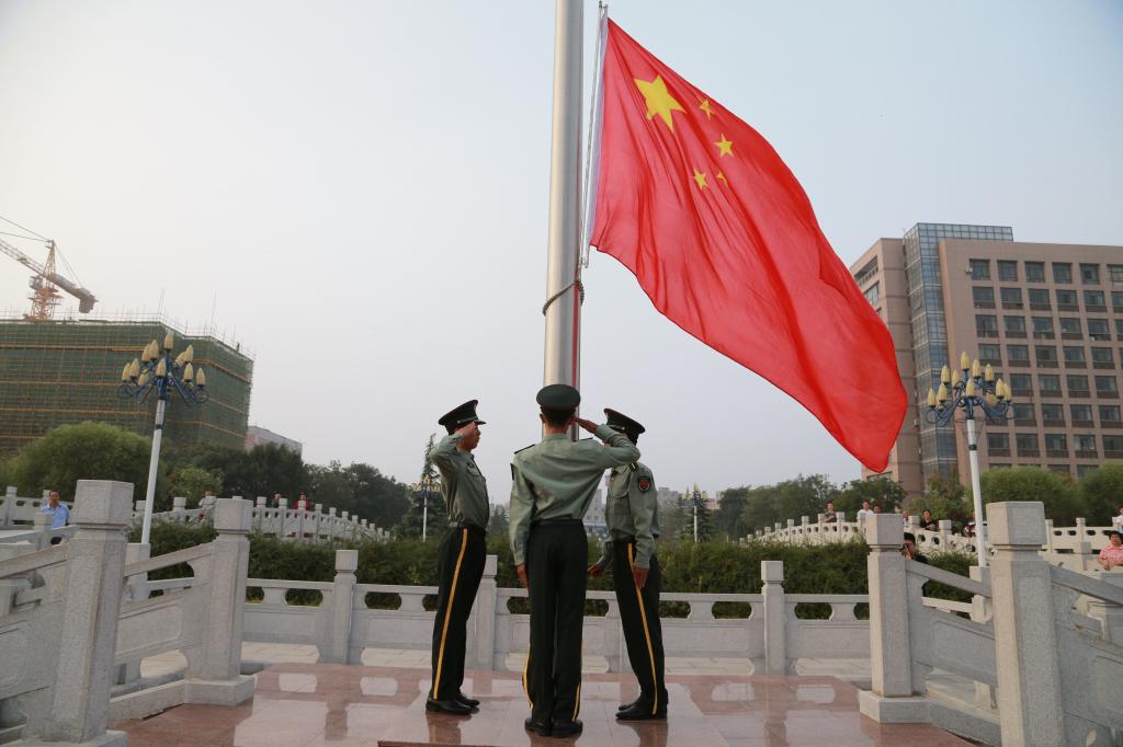 清晨7時(shí)整,圖書(shū)館南廣場(chǎng)莊嚴(yán)肅穆,一千多名大學(xué)生和老師肅立于此,隨著激昂的《義勇軍進(jìn)行曲》奏響,升旗手振臂一揮,鮮艷的五星紅旗迎風(fēng)展開(kāi),全場(chǎng)師生莊重地行注目禮,同時(shí)共唱國(guó)歌。五星紅旗在雄壯的國(guó)歌聲中迎著朝陽(yáng)冉冉升起,飄揚(yáng)在蔚藍(lán)的天空……