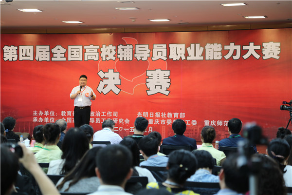 全國高校輔導員職業(yè)能力大賽由教育部思想政治工作司主辦,旨在提高輔導員職業(yè)能力,提升輔導員工作水平。本屆大賽自2015年1月啟動,歷時近五個月,分初賽、復賽、決賽三個階段。初賽由各省級教育主管部門組織;復賽全國分六個賽區(qū),由有關省級教育工作部門、有關高校共同承辦;決賽由教育部思想政治工作司、光明日報社主辦,全國高校輔導員工作研究會與中共重慶市委教育工委、重慶師范大學共同承辦。經(jīng)過陜西省初賽、全國第三賽區(qū)復賽的層層選拔,我校選手李鵬、劉倩以第三賽區(qū)一等獎獲得者的身份與其他10名選手一起代表第三賽區(qū)8個省區(qū)參加全國總決賽。
